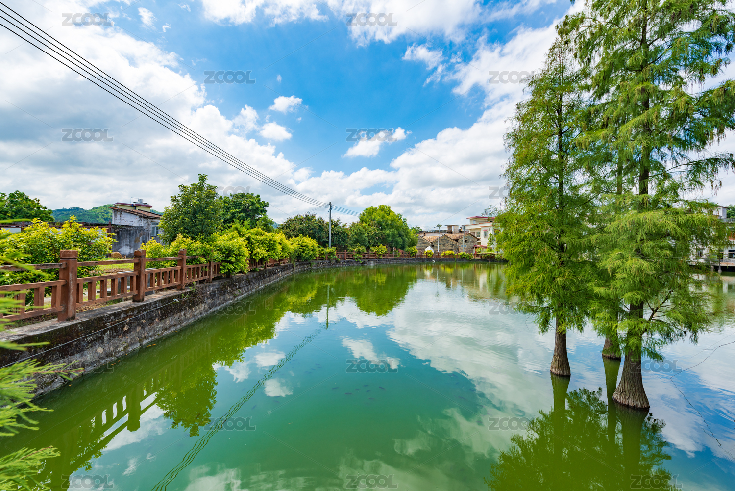 广东清远佛冈县上岳古村蓝天白云下的池塘