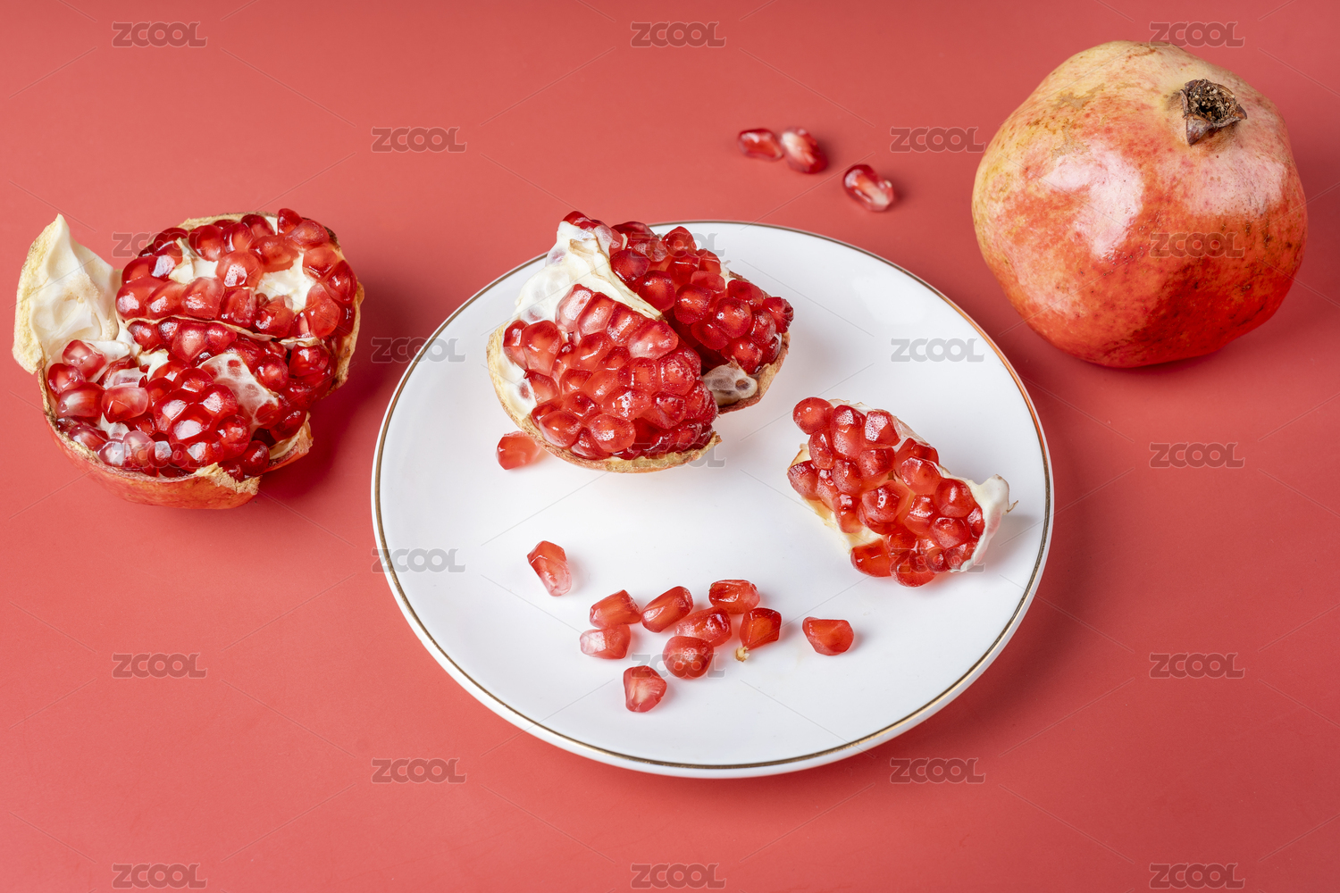 红石榴摆放在红色背景上特写