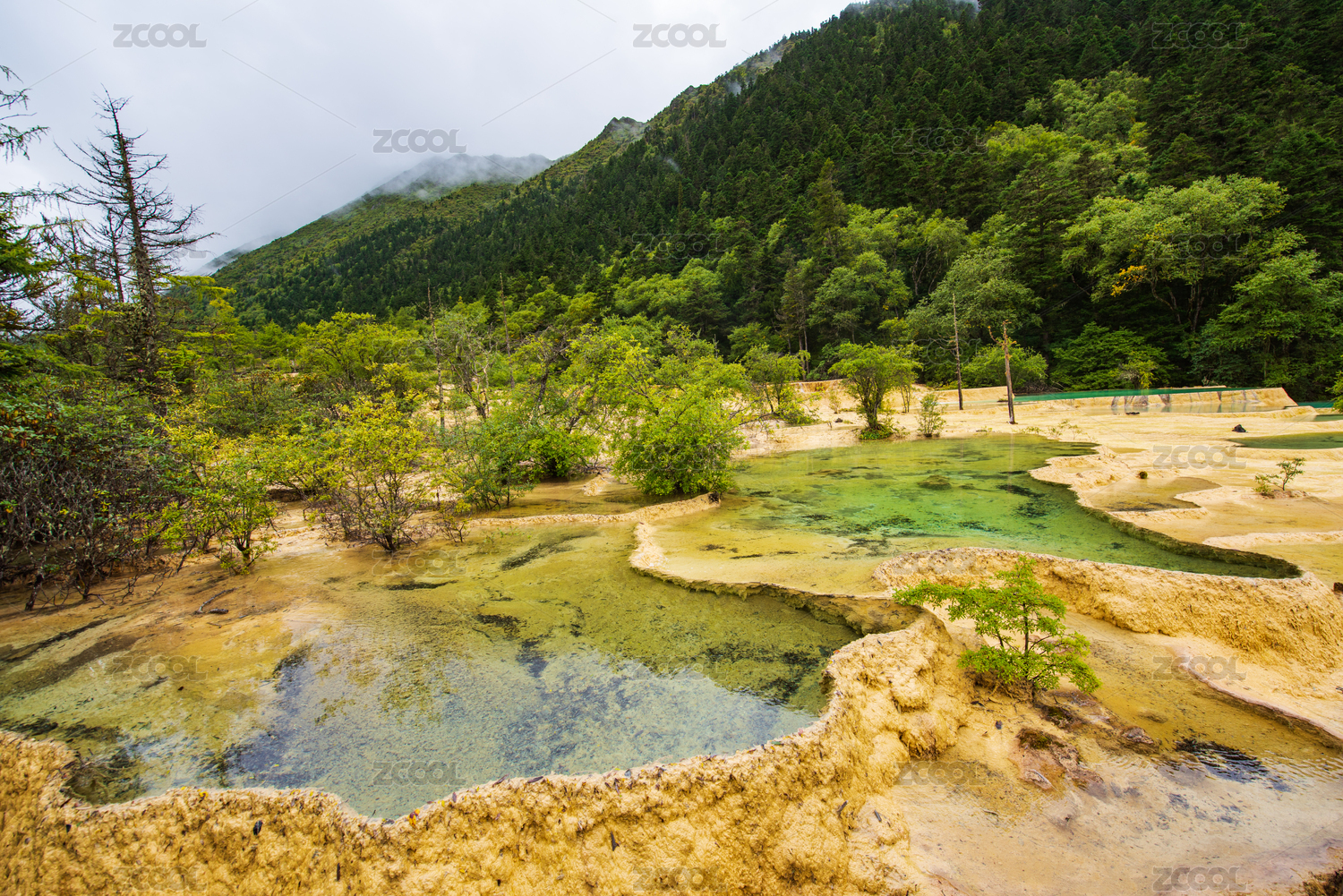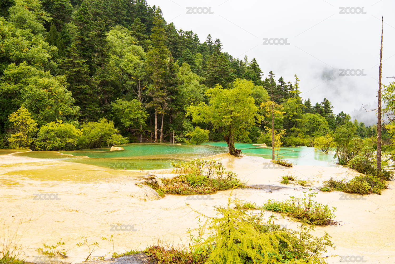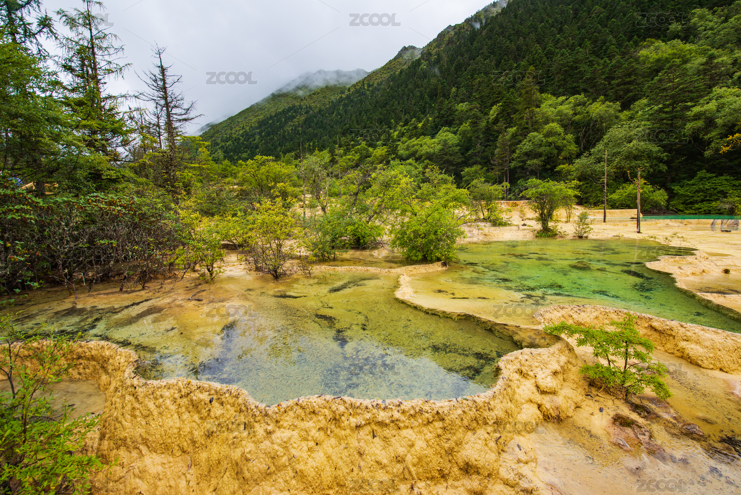 四川,黄龙,雨天,靛蓝,树木,瑶池,五彩池,彩池,水,地质