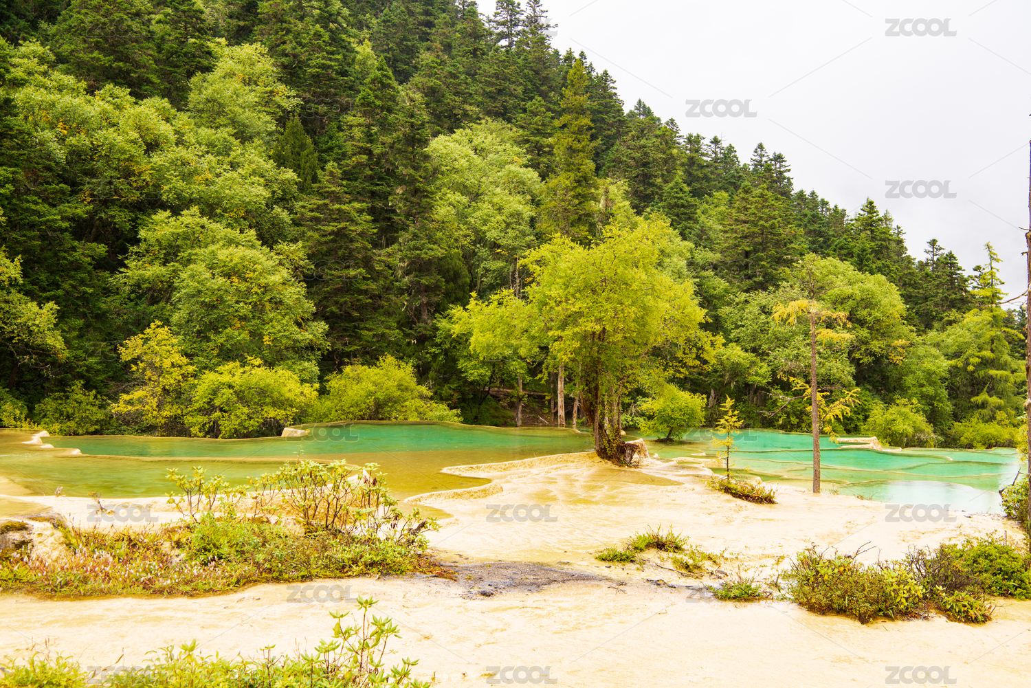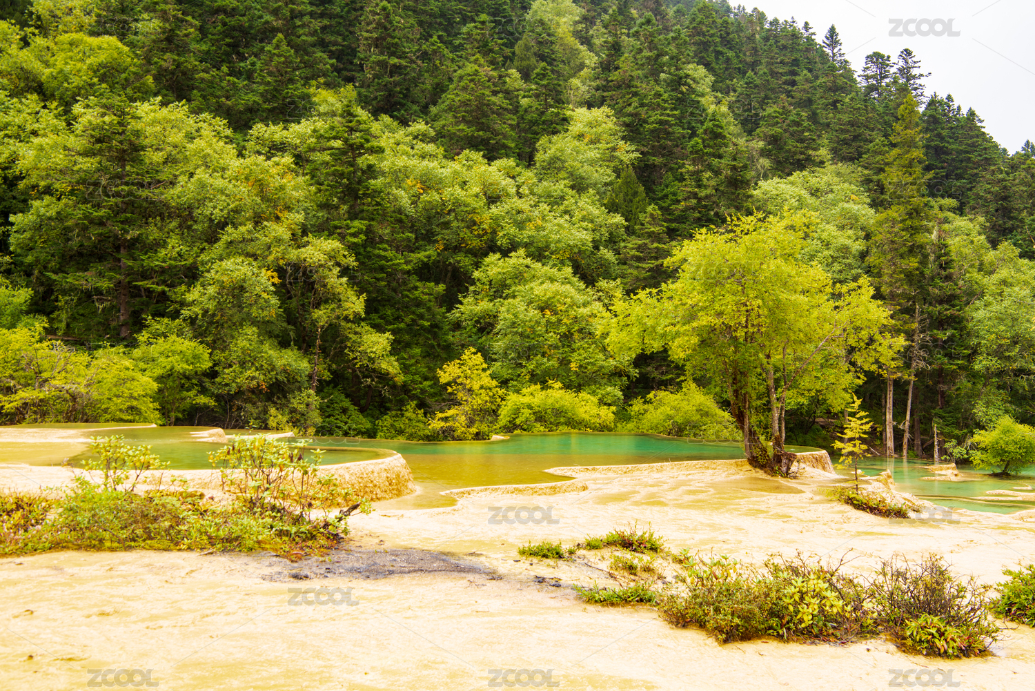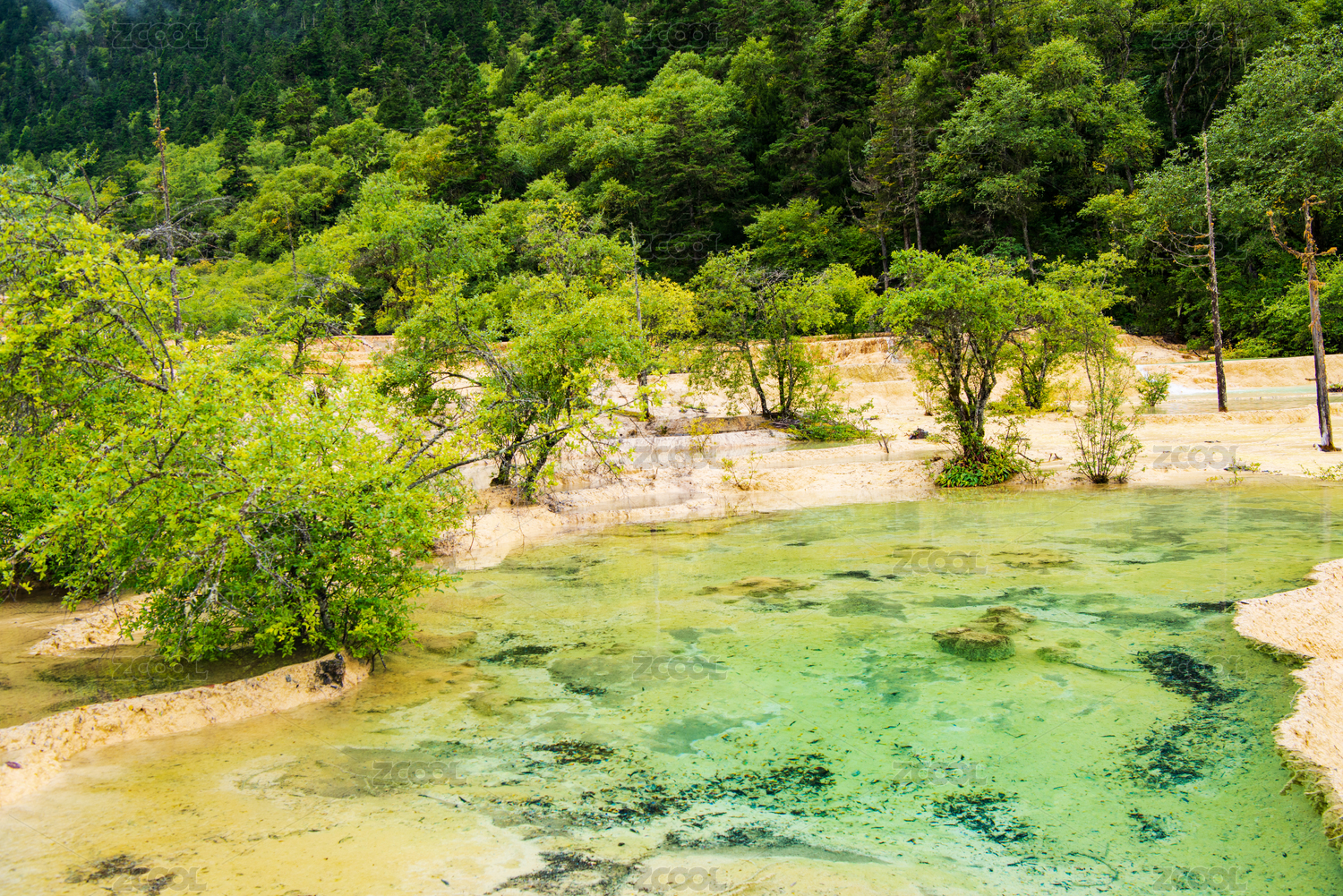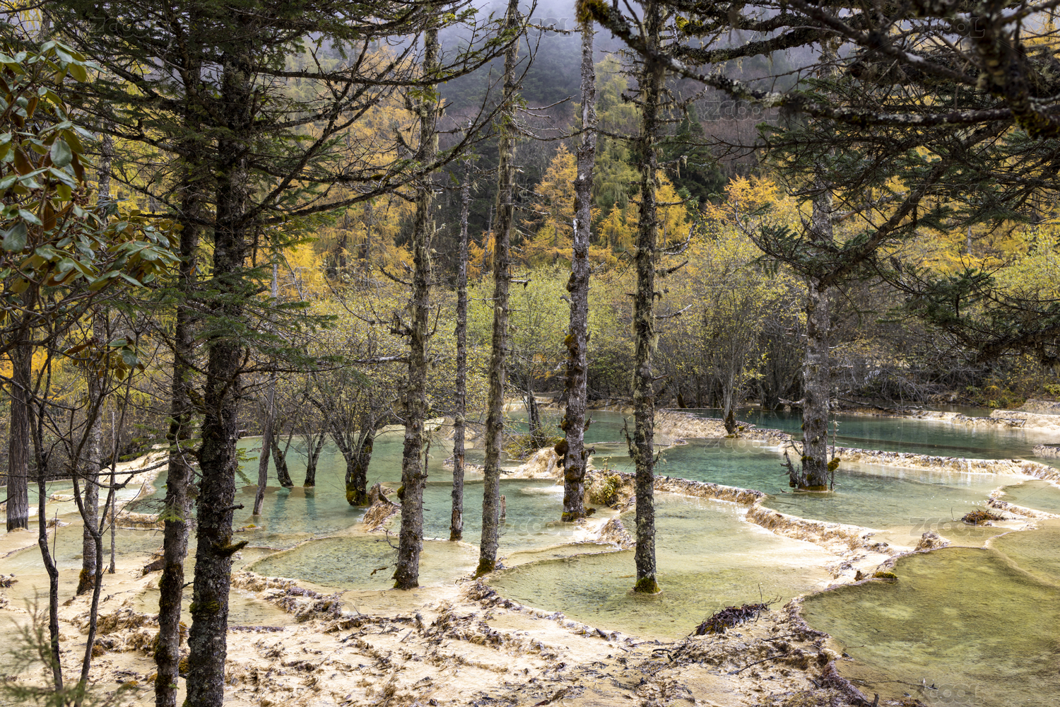 四川,黄龙,雨天,靛蓝,树木,瑶池,五彩池,彩池,水,地质