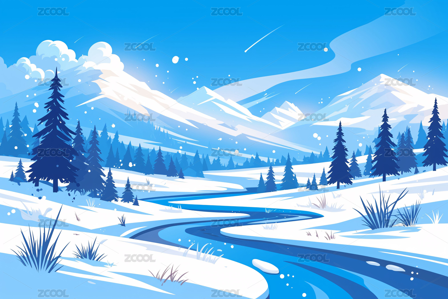 冬季大雪节气插画,雪景中的冬天河流场景插