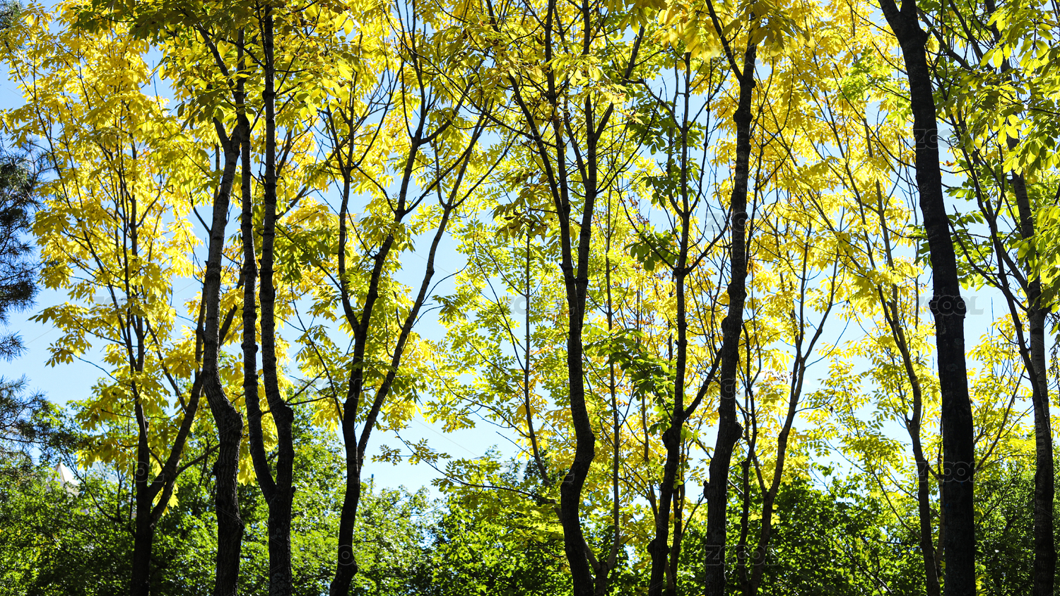 秋天晴朗天气森林里金黄色树叶风景的背景图