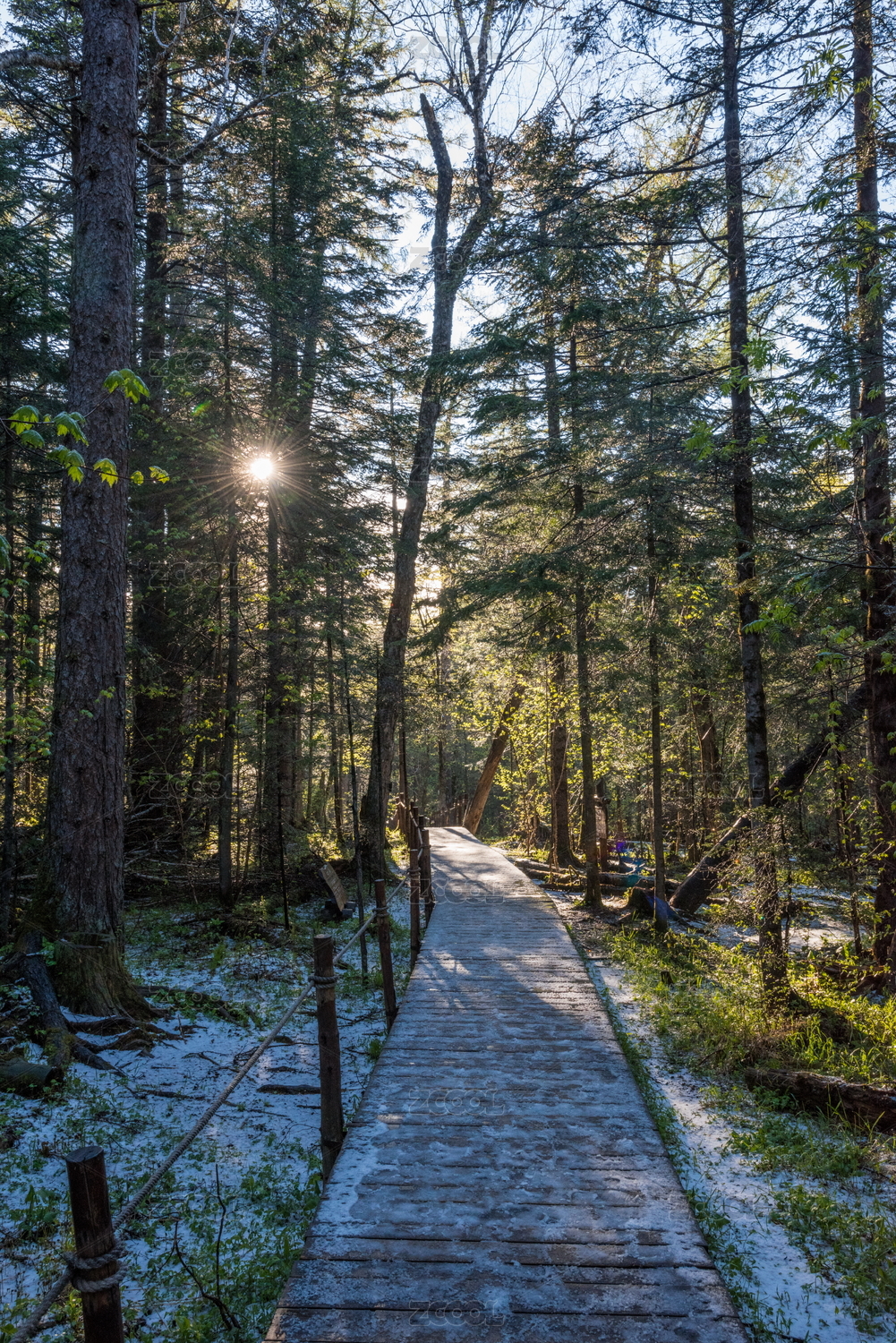 森林木栈道中间生长的一颗杉树