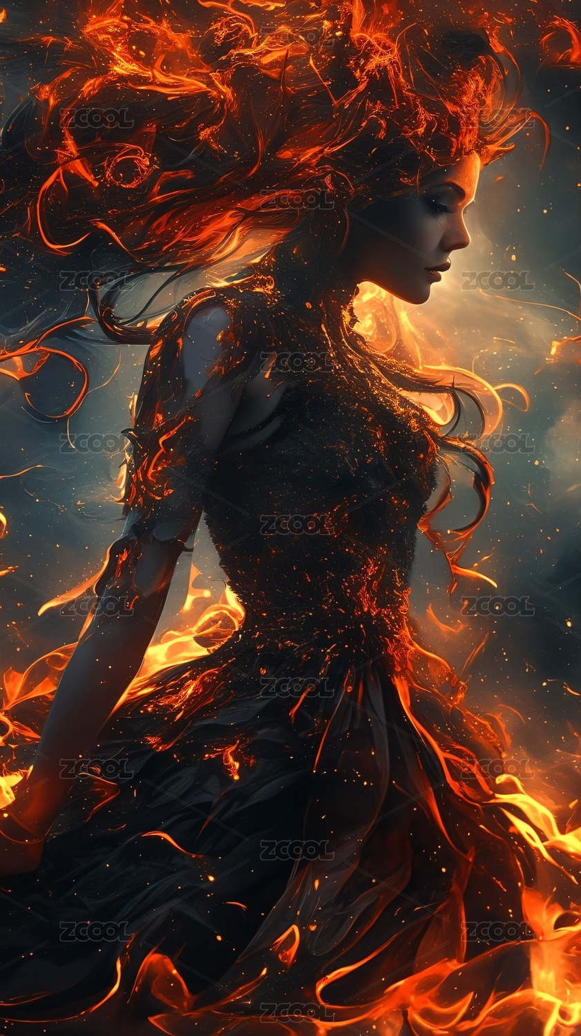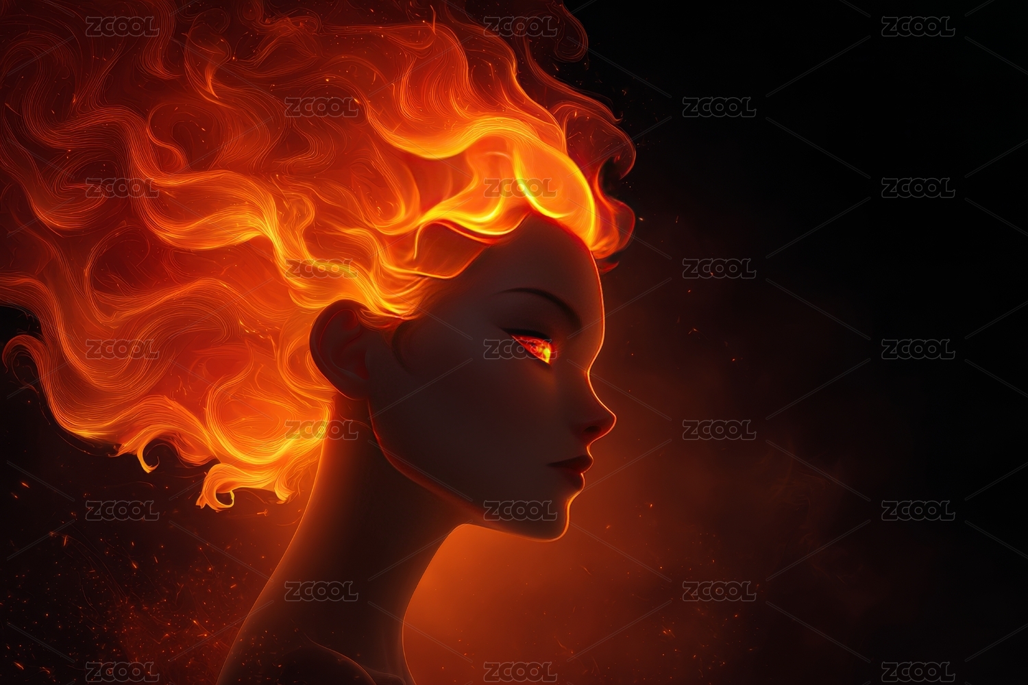 魅惑红眼女子暗夜降临,火焰缭绕神秘气息