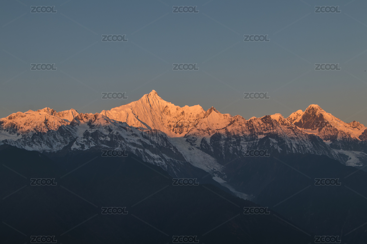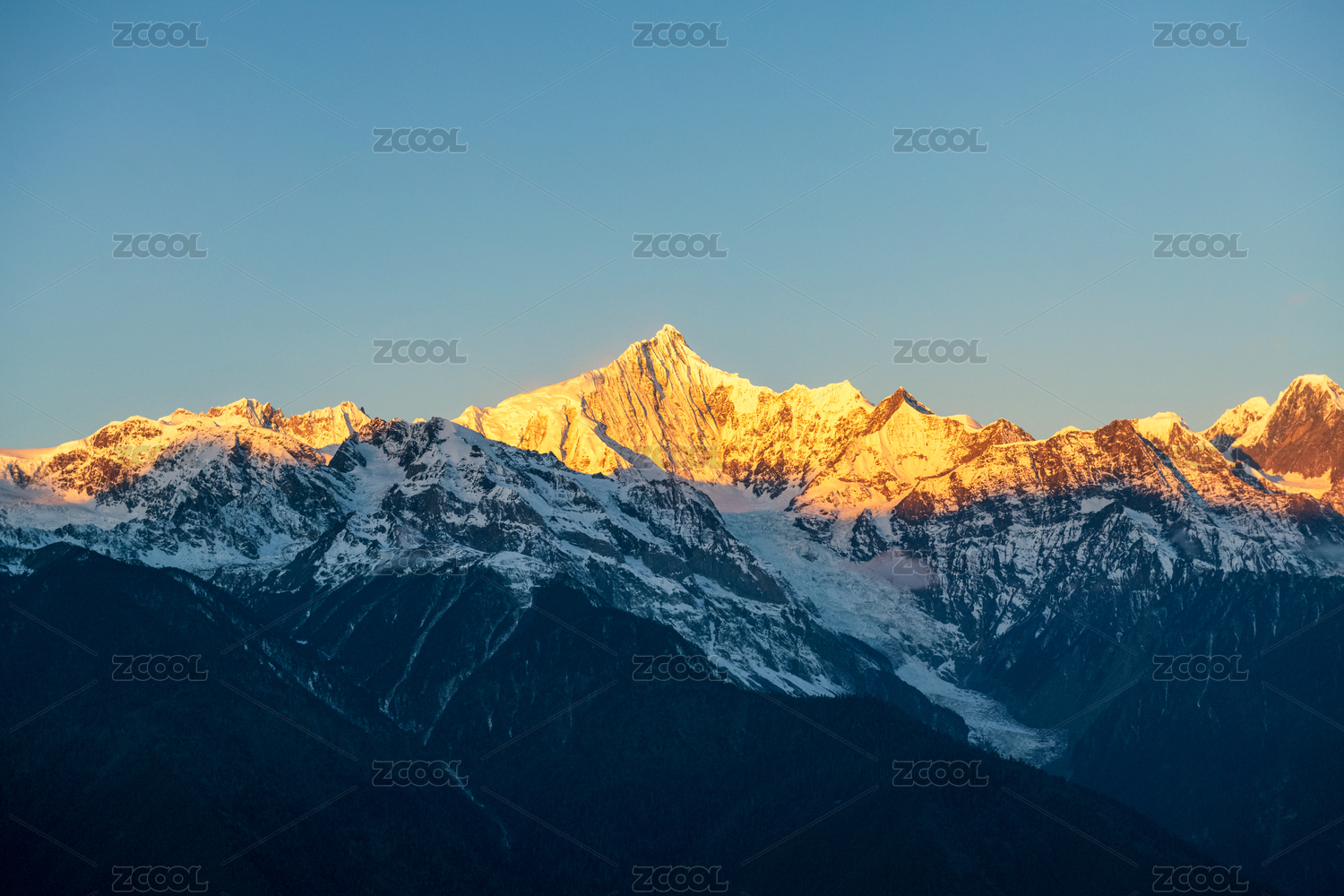 云南梅里雪山十三峰日照金山与蓝调时刻晴天