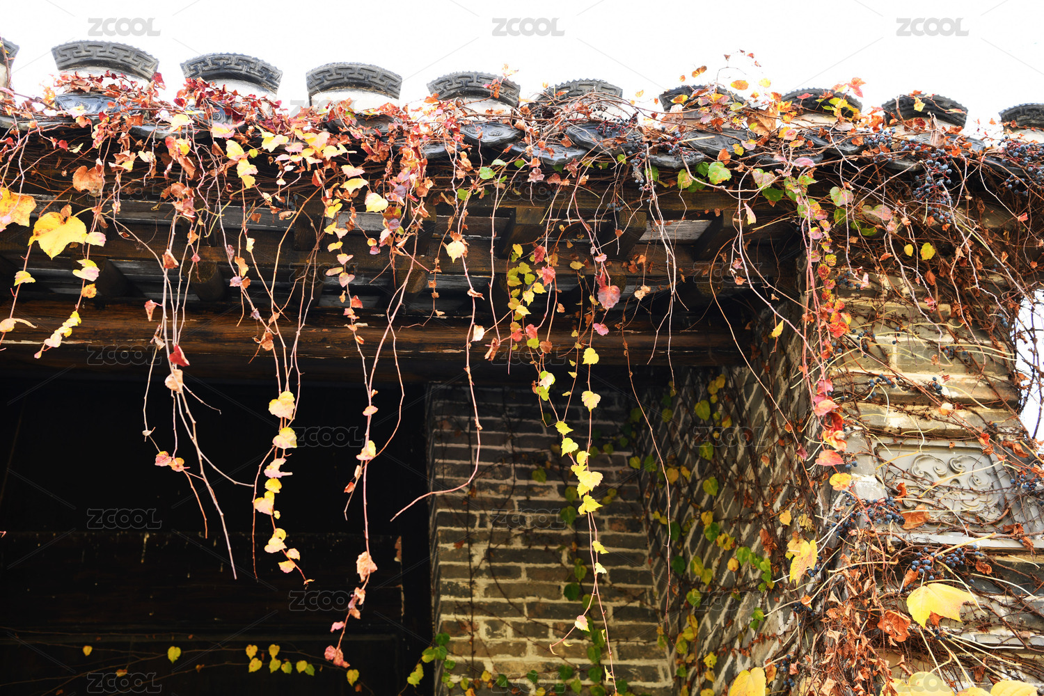 江南水乡乌镇马头墙屋檐爬山虎秋色