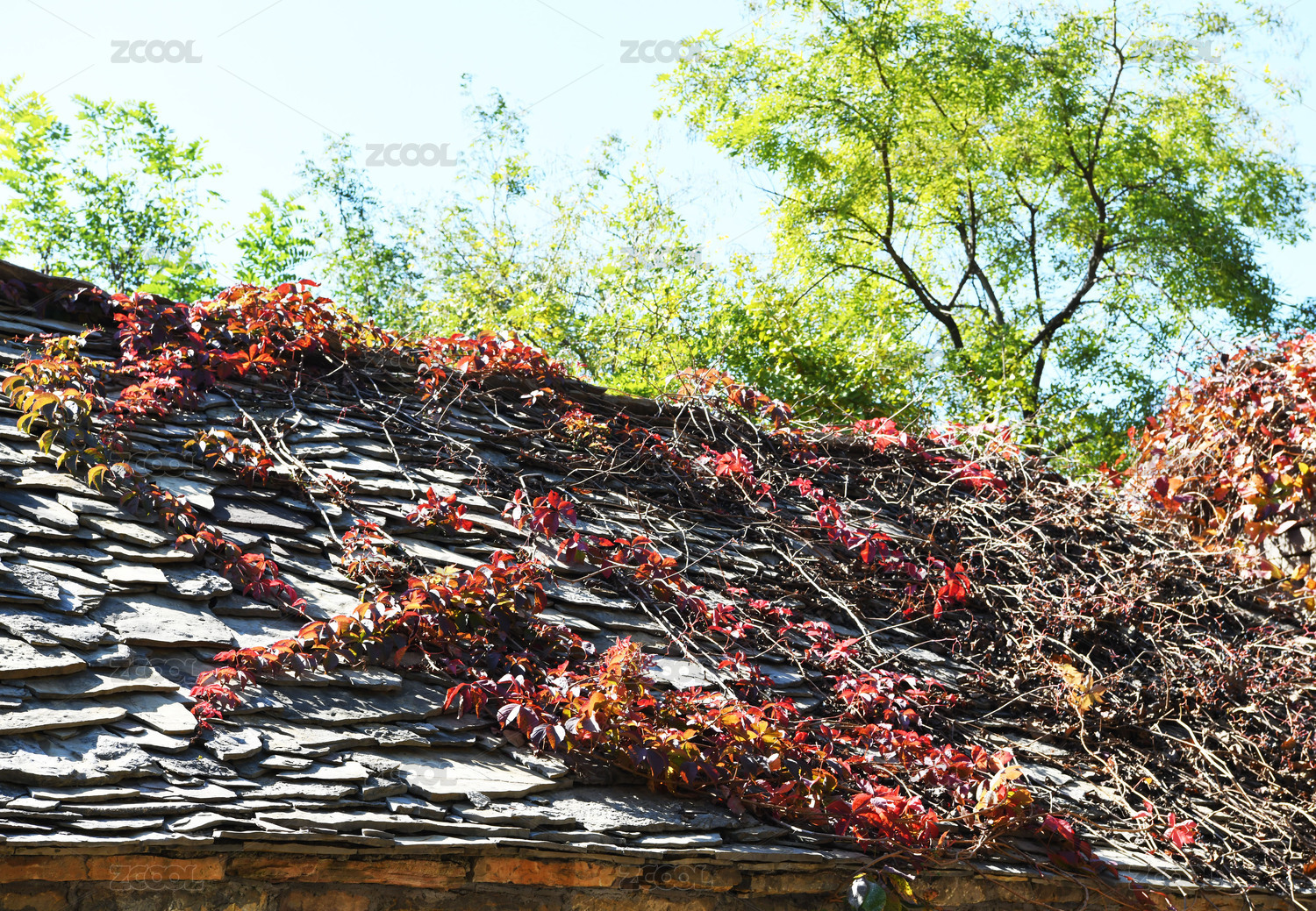 中国山东枣庄兴隆庄石板房古村落爬山虎红叶