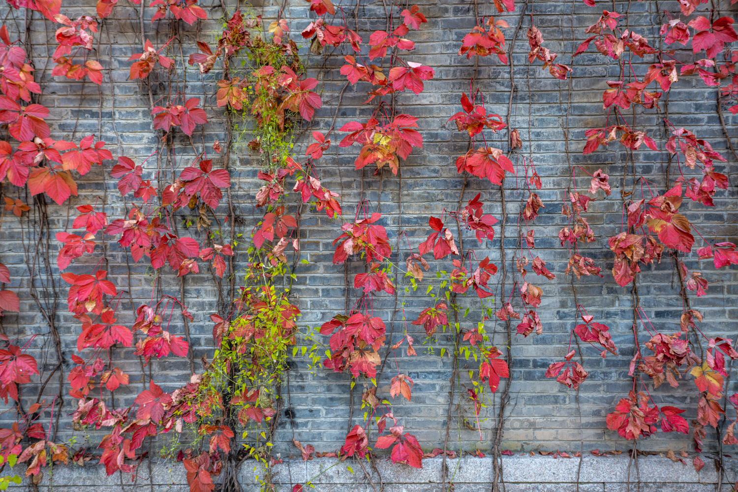 安徽省黟县塔川秋天白墙红色爬墙虎爬山虎