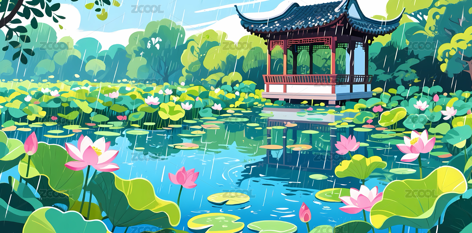 雨中荷塘与传统亭阁