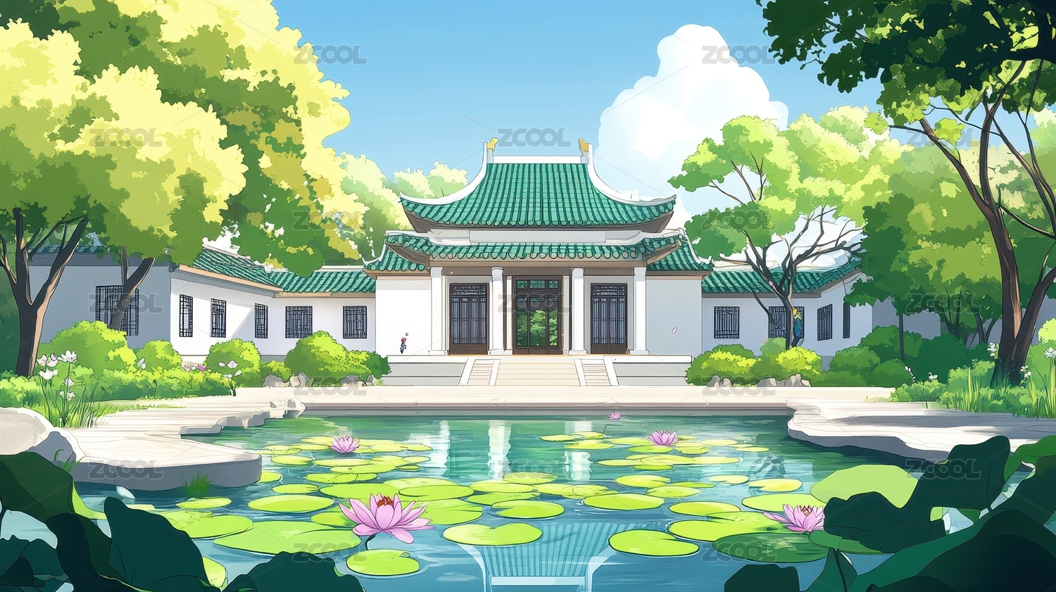 公园亭子与荷花池插画