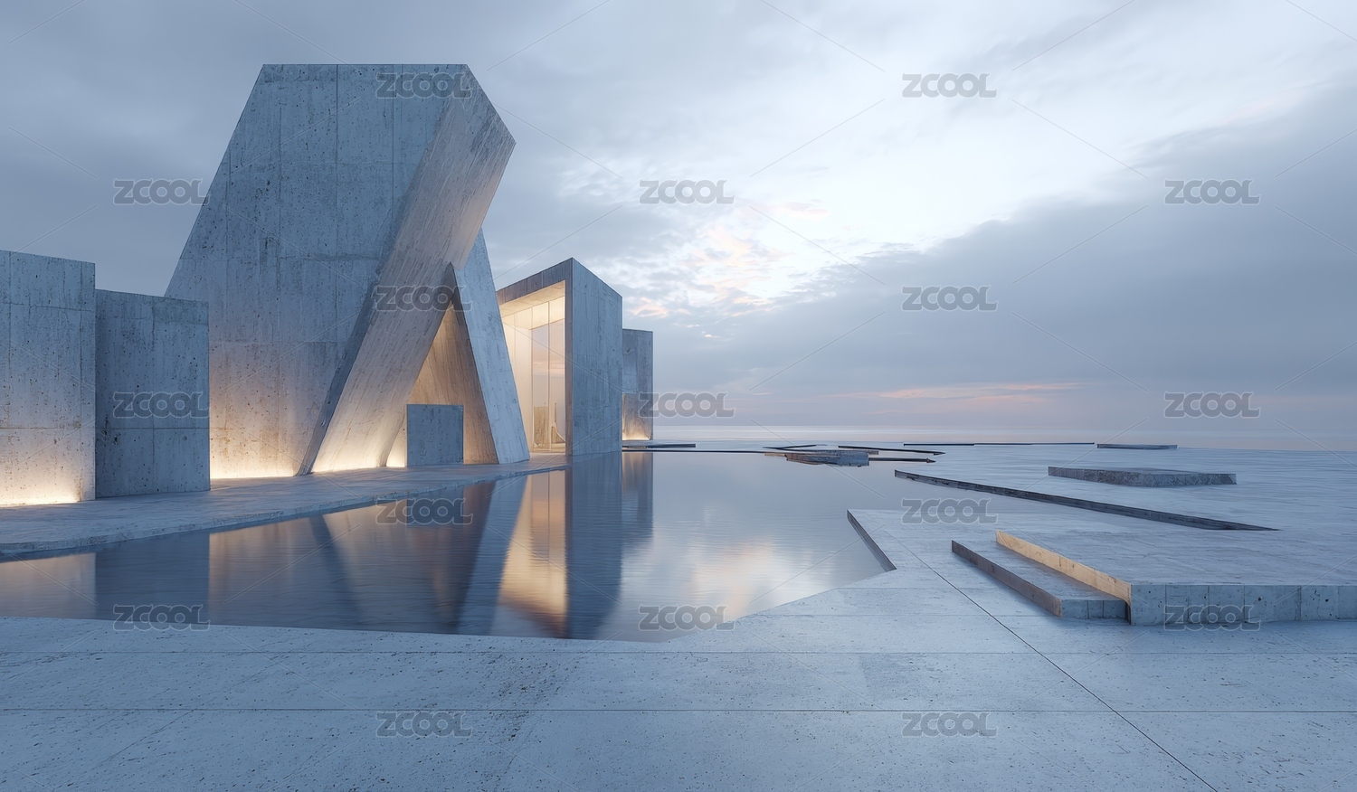 现代混凝土建筑与反光泳池