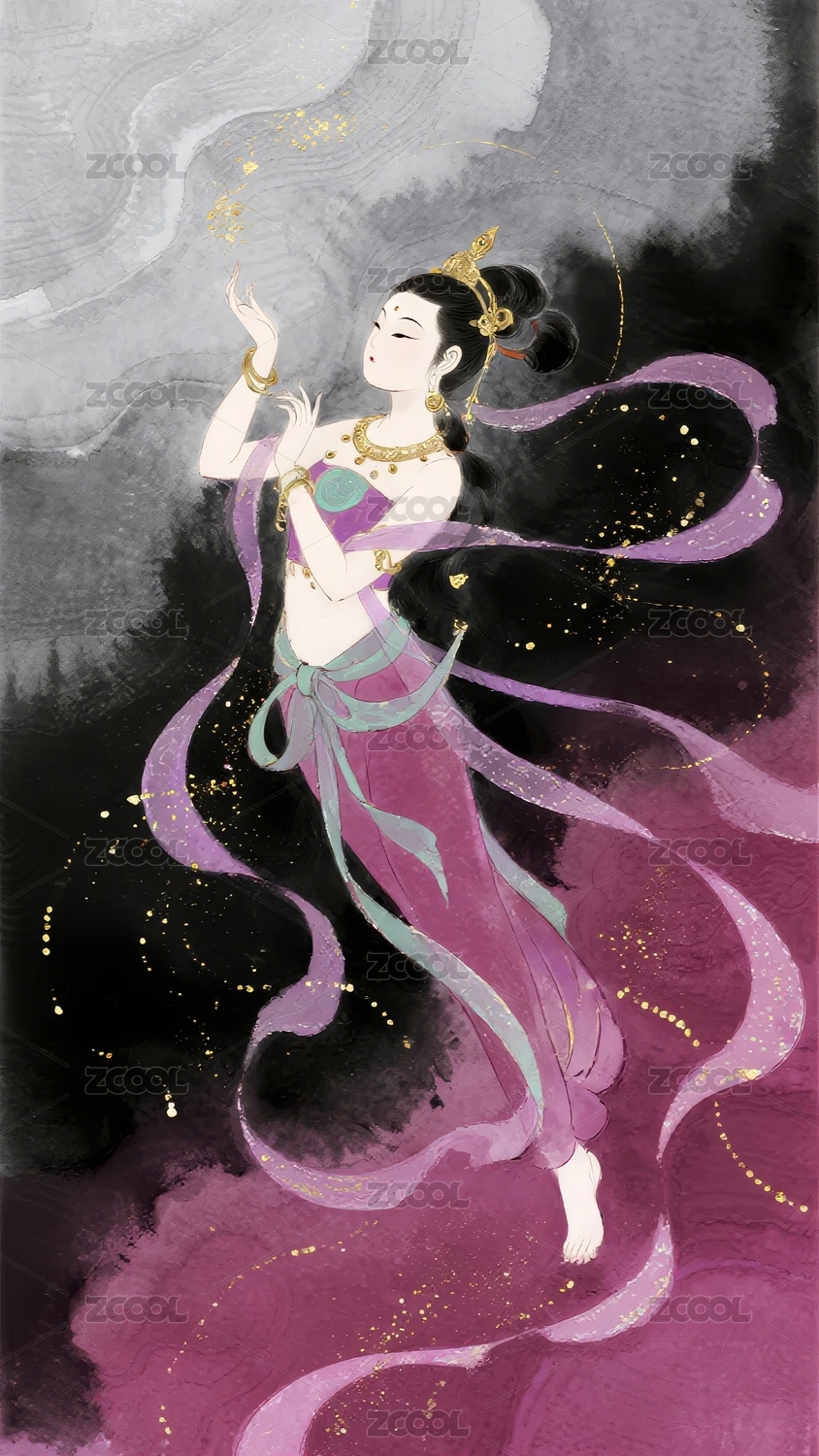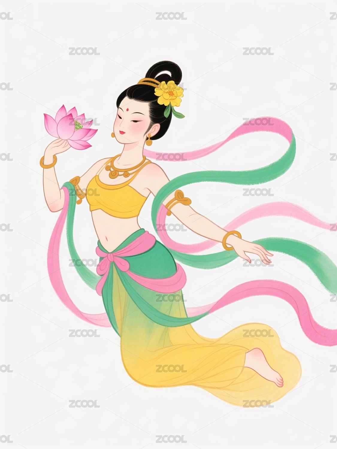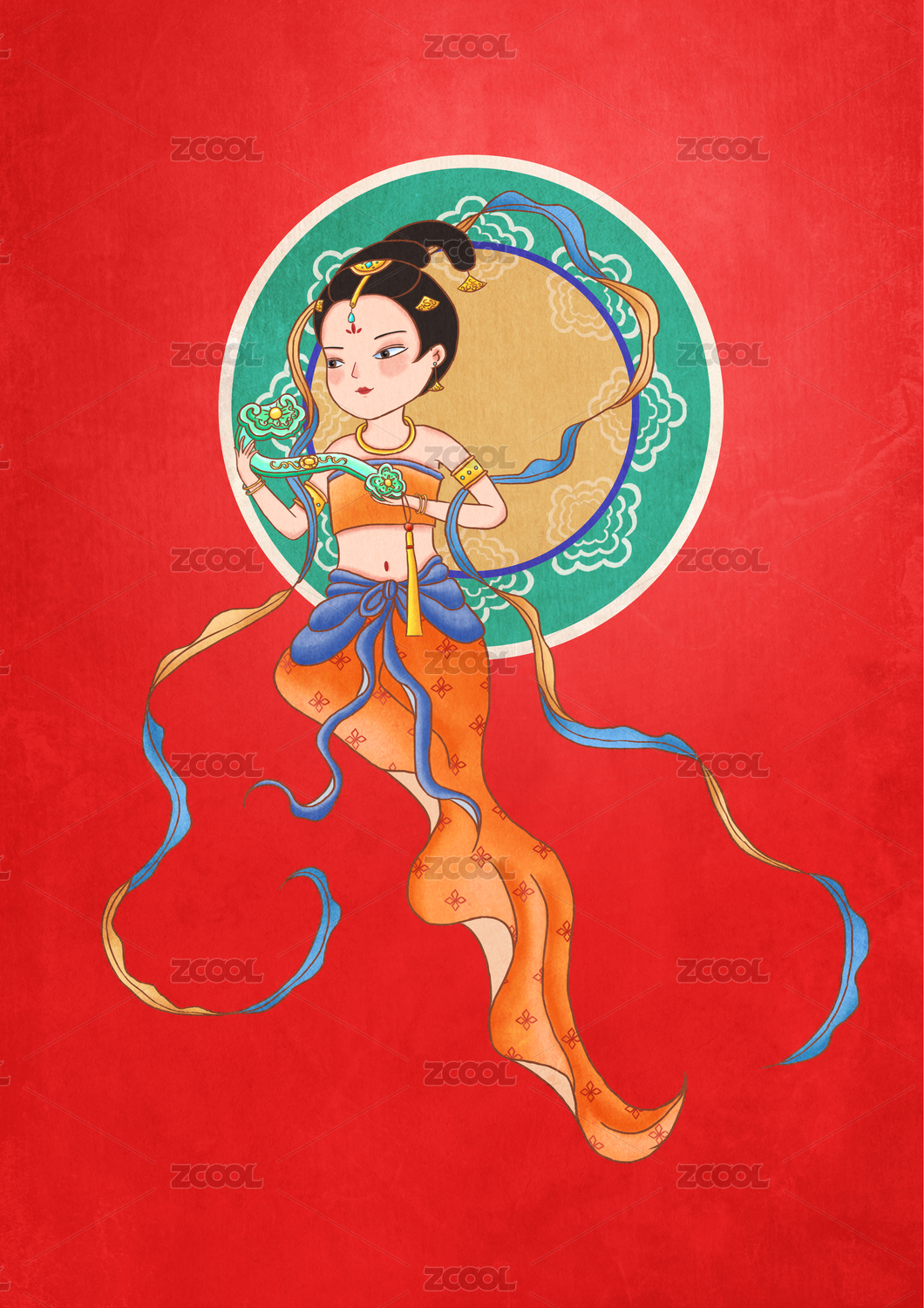 敦煌壁画手拿绿如意飞天仙女图古风竖版插画