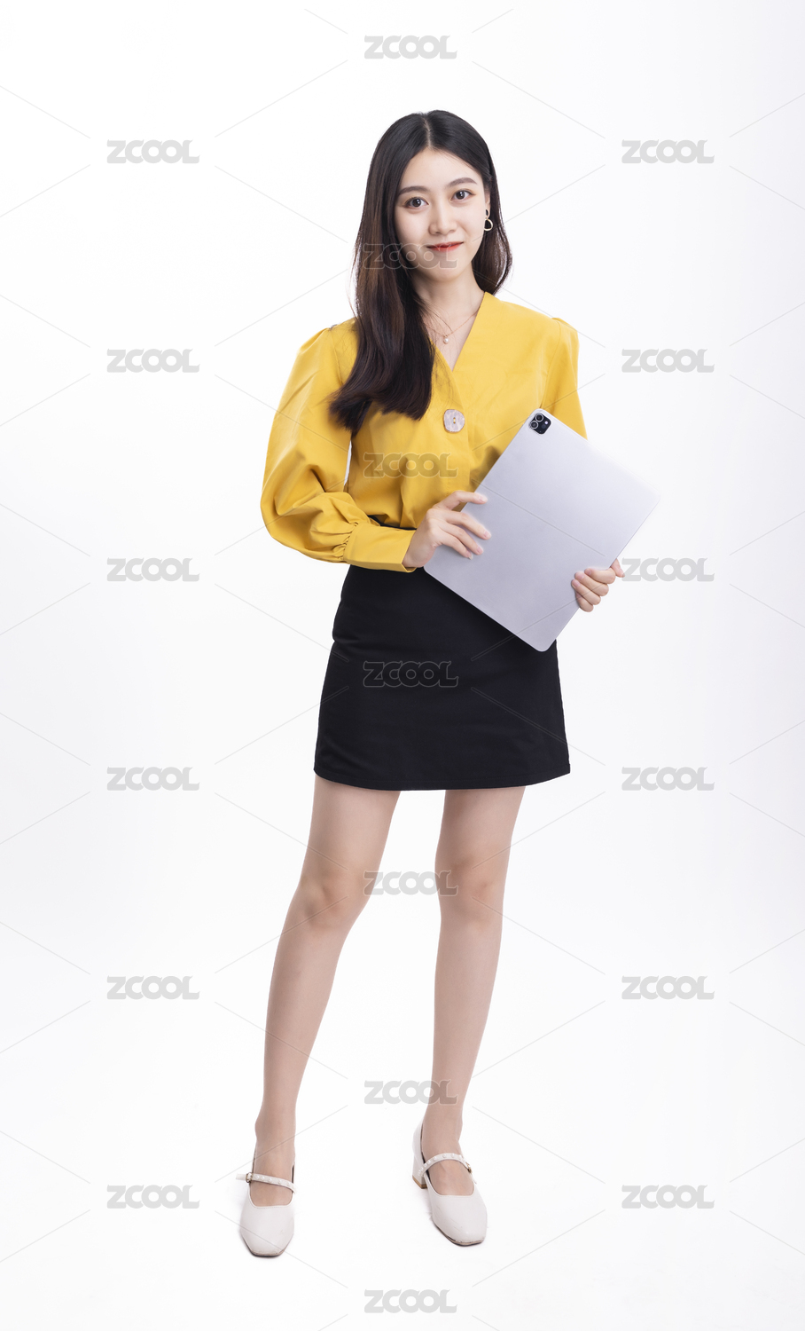 穿黄色正装黑色短裙拿着平板电脑的职业女性