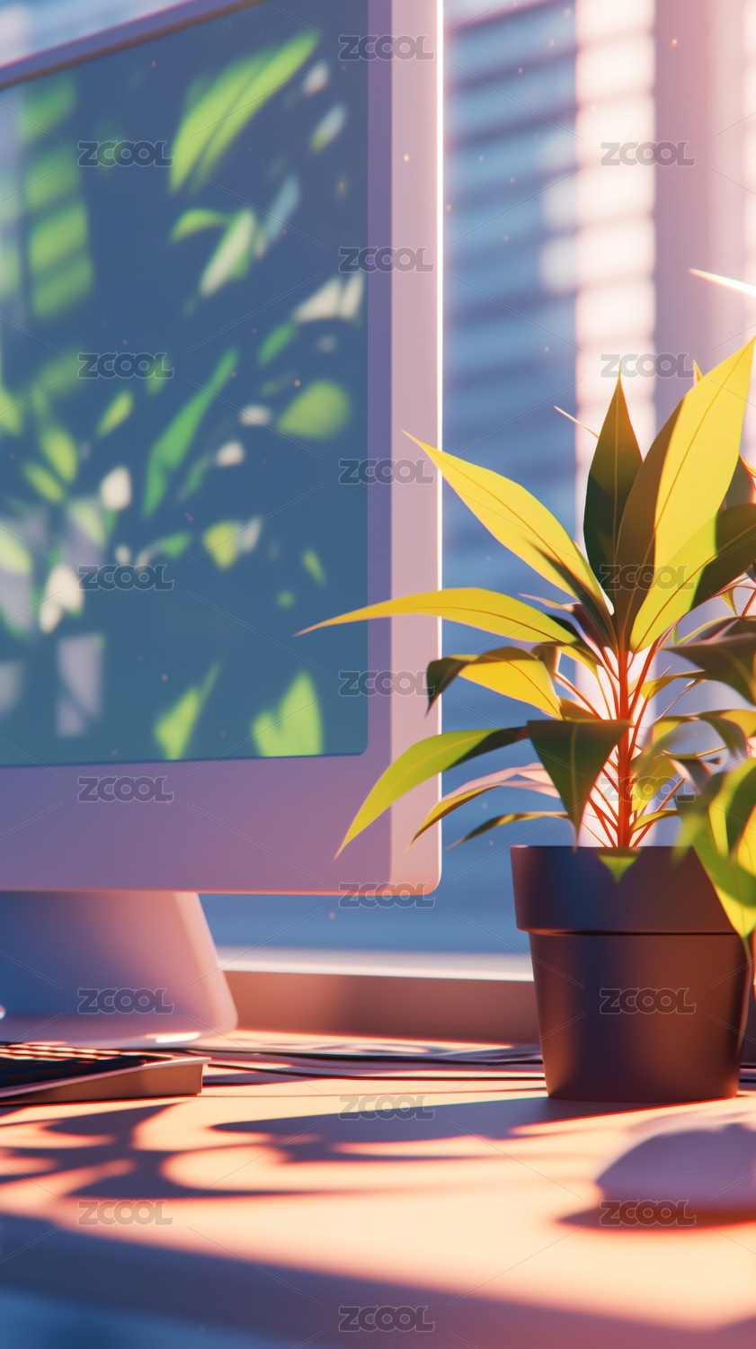 清新明亮办公室有电脑盆景的办公桌3D插画