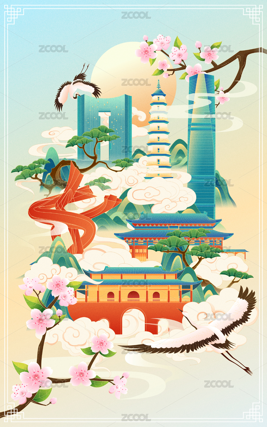 春天国风郑州城市地标建筑彩色矢量插画海报