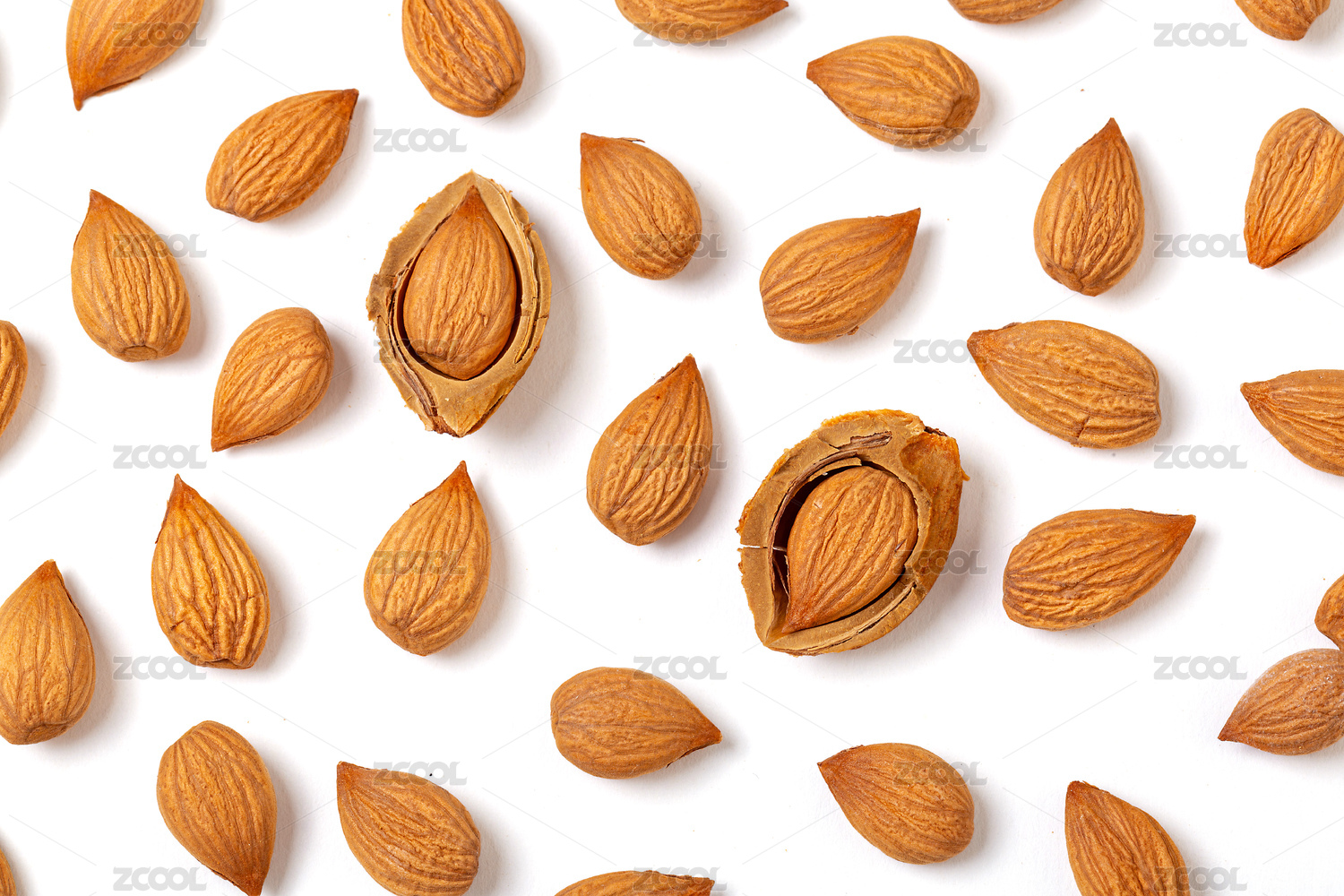 白底上摆放着整齐的手剥巴旦木和巴旦木仁