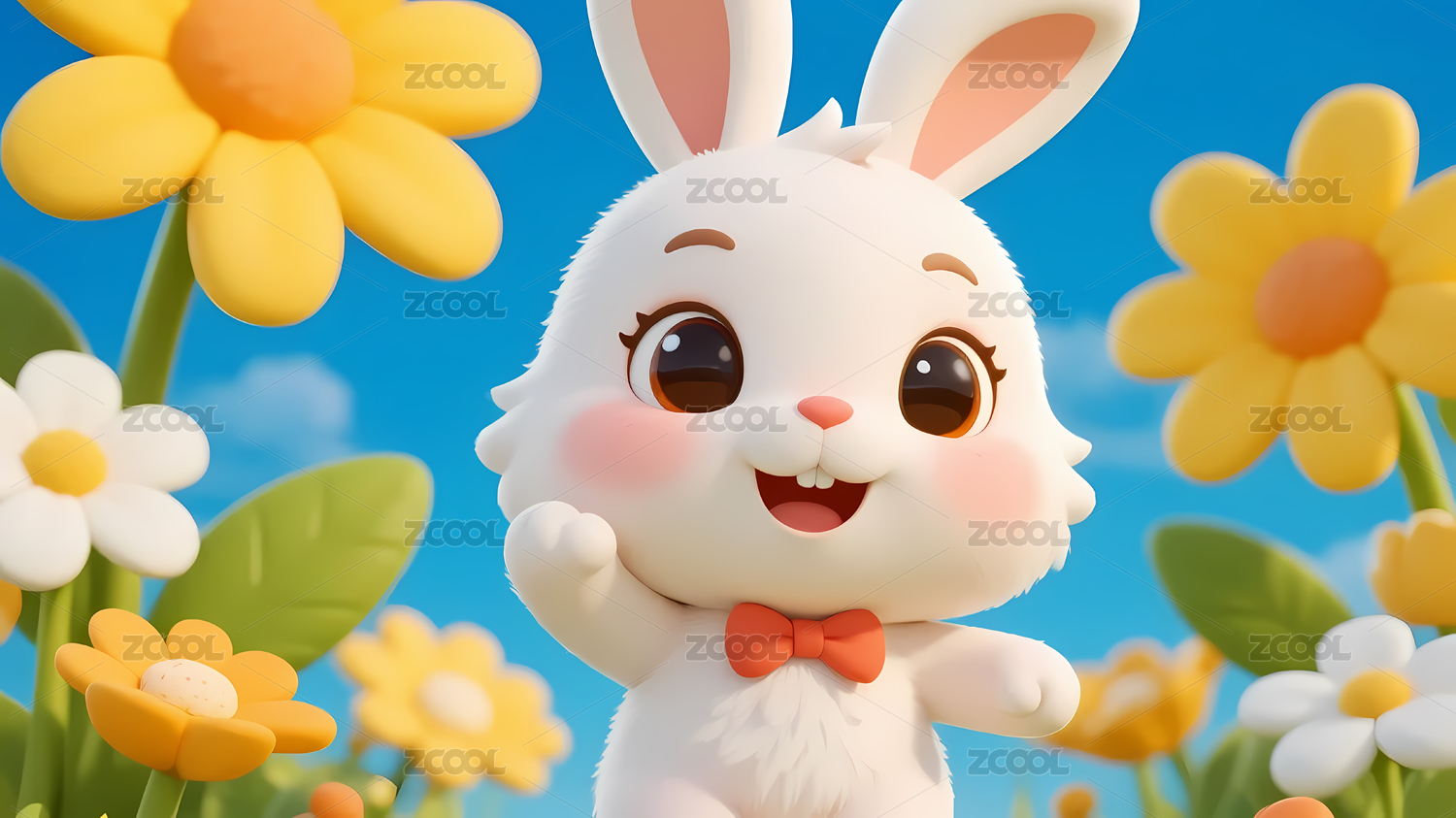 白色兔子蓝天花朵