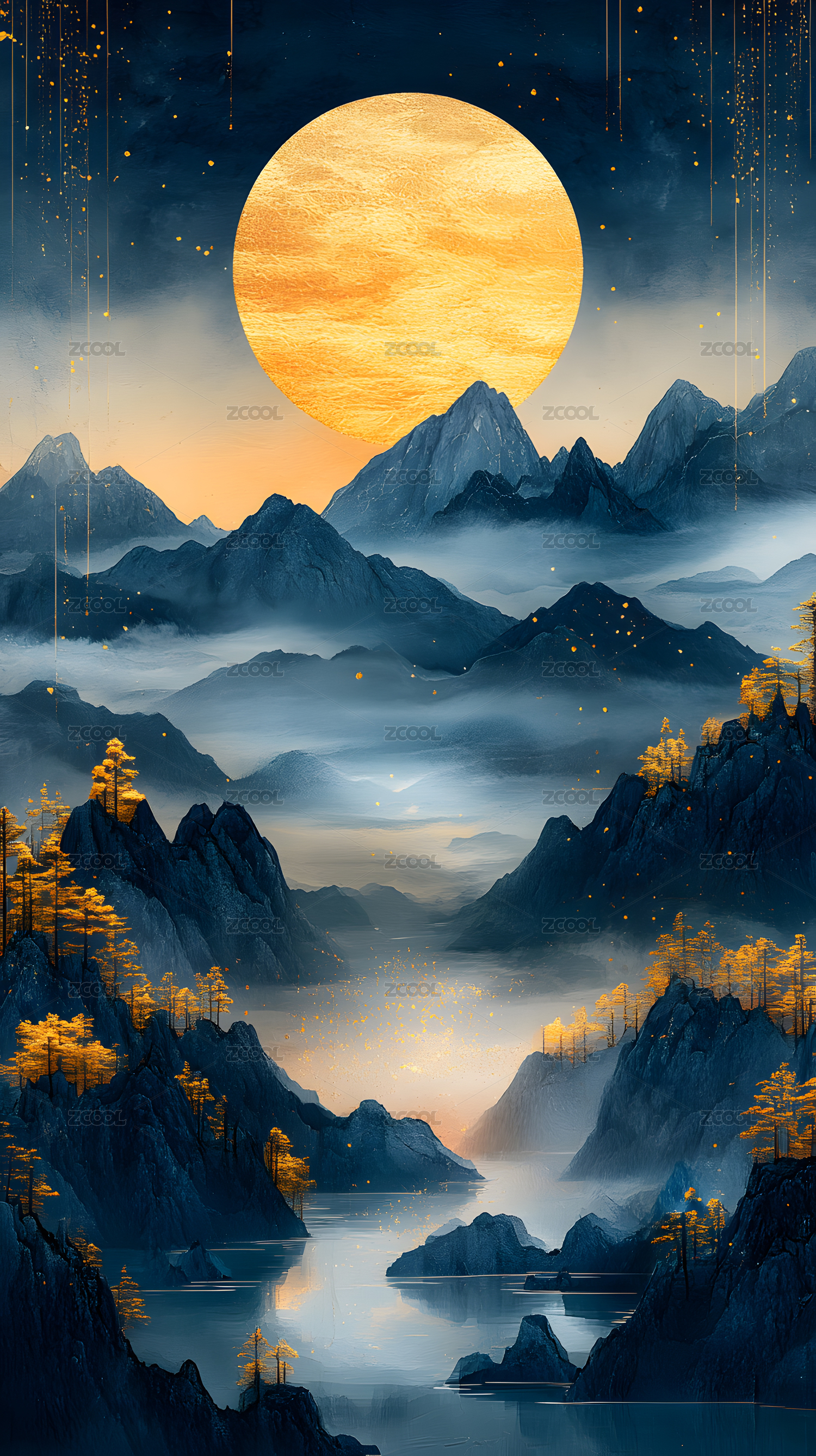 金色圆月下的蓝色山峦