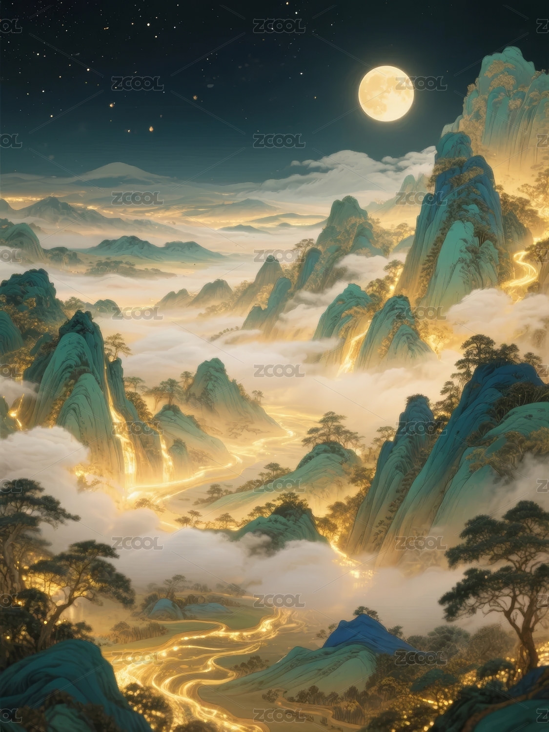 梦幻山水月夜图