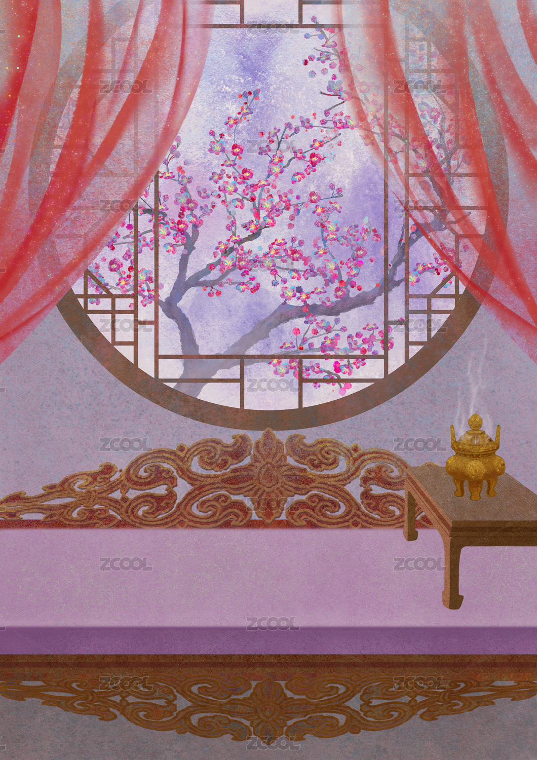 窗帘网纱卧室房间床榻门窗户外梅花桌子香炉