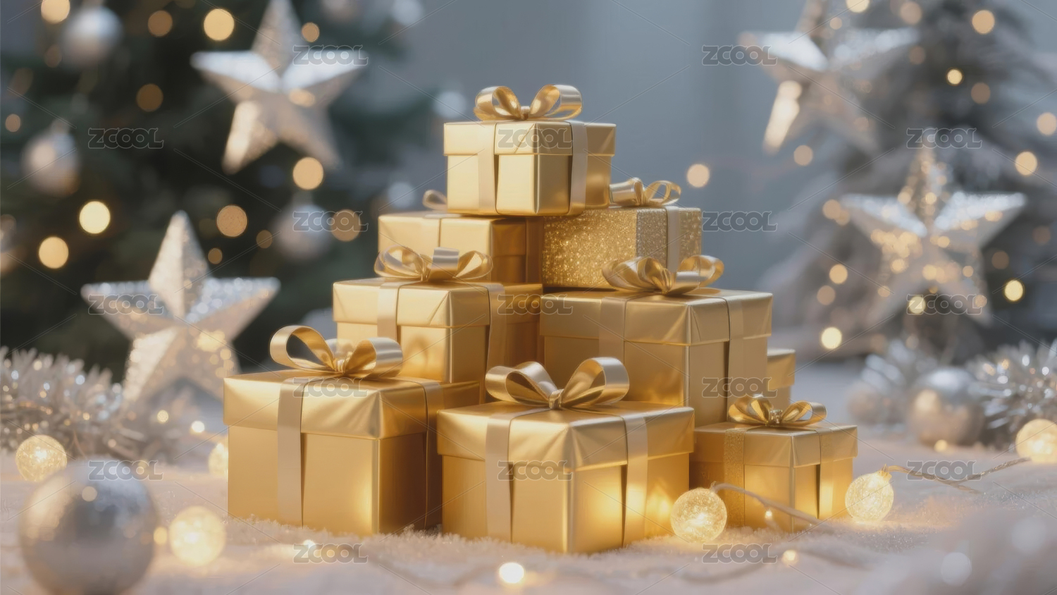 金色蝴蝶结礼物雪景