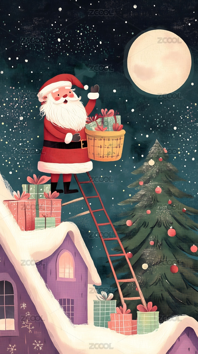圣诞老人怀抱礼物树的温馨场景