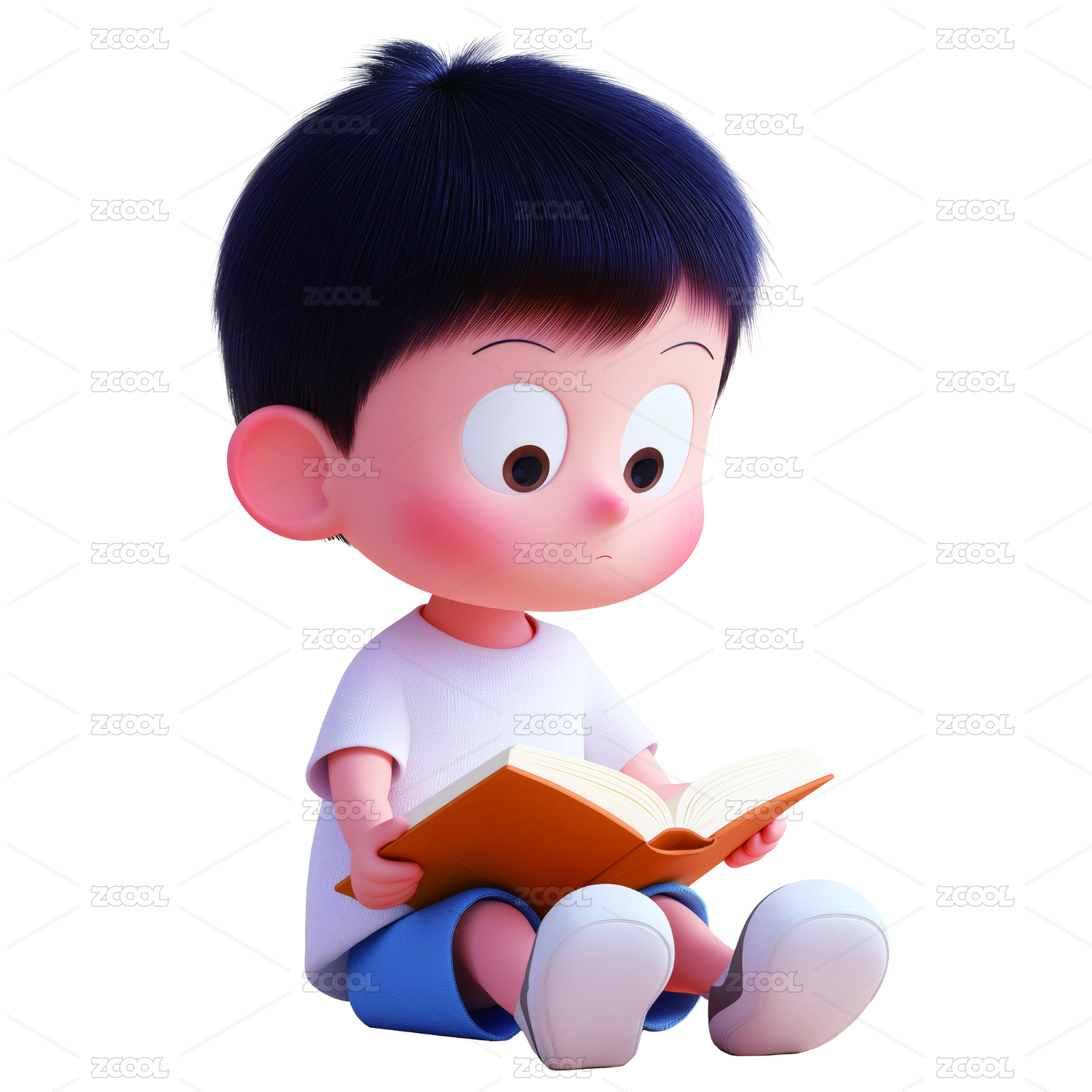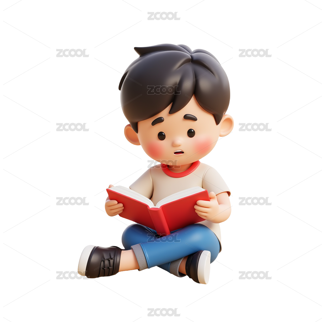 白底3D卡通风格坐在书本上微笑看书的儿童