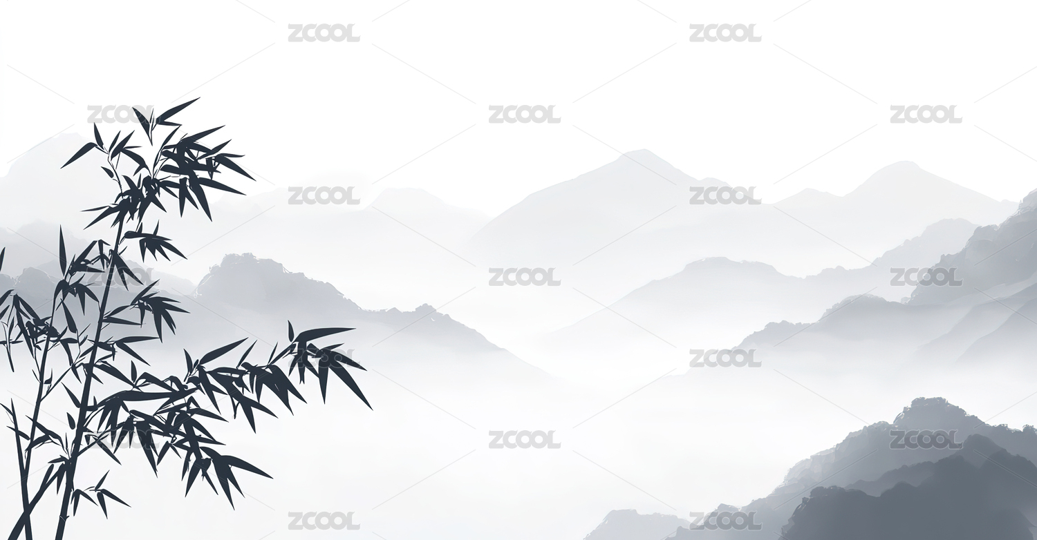 水墨竹影与远山