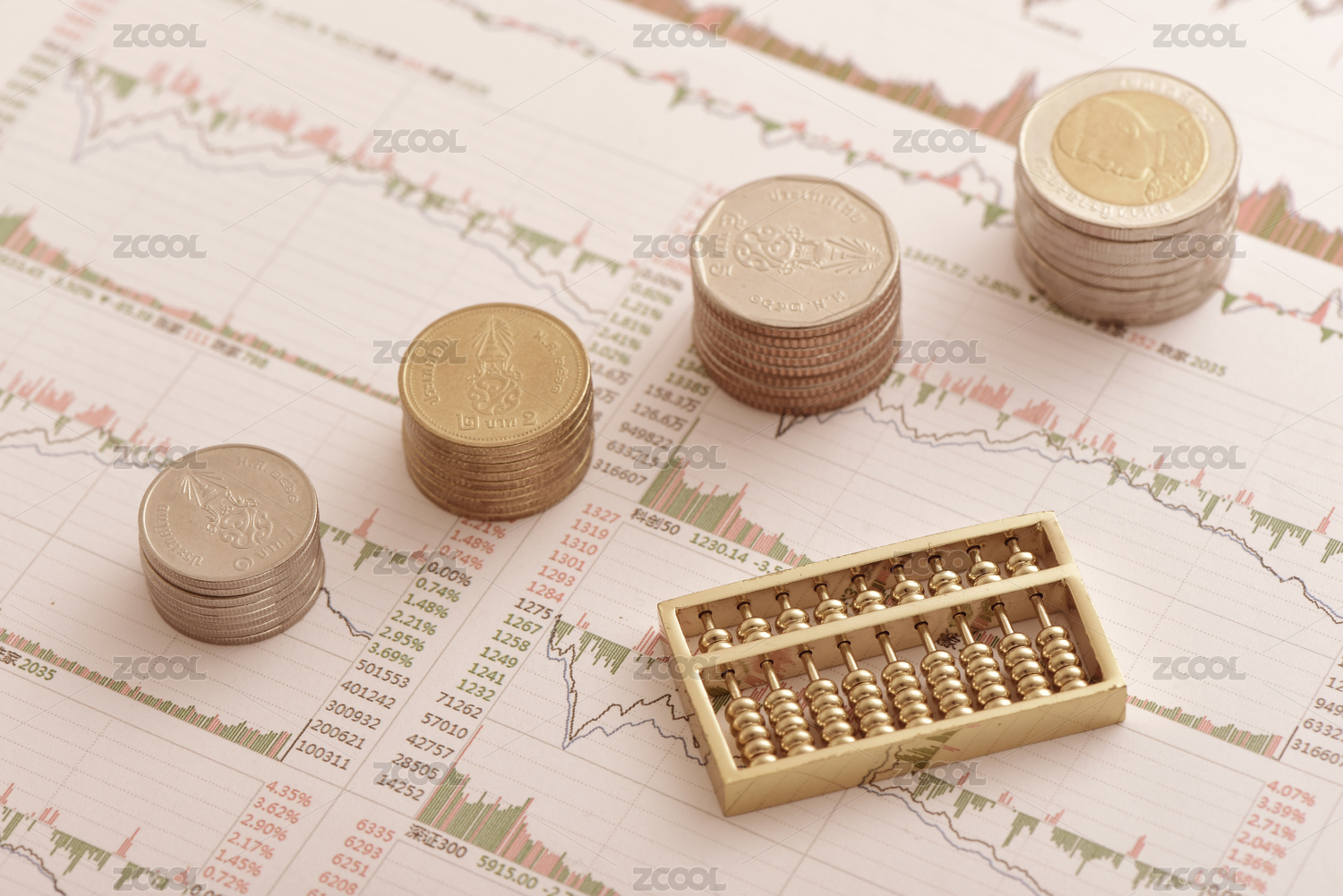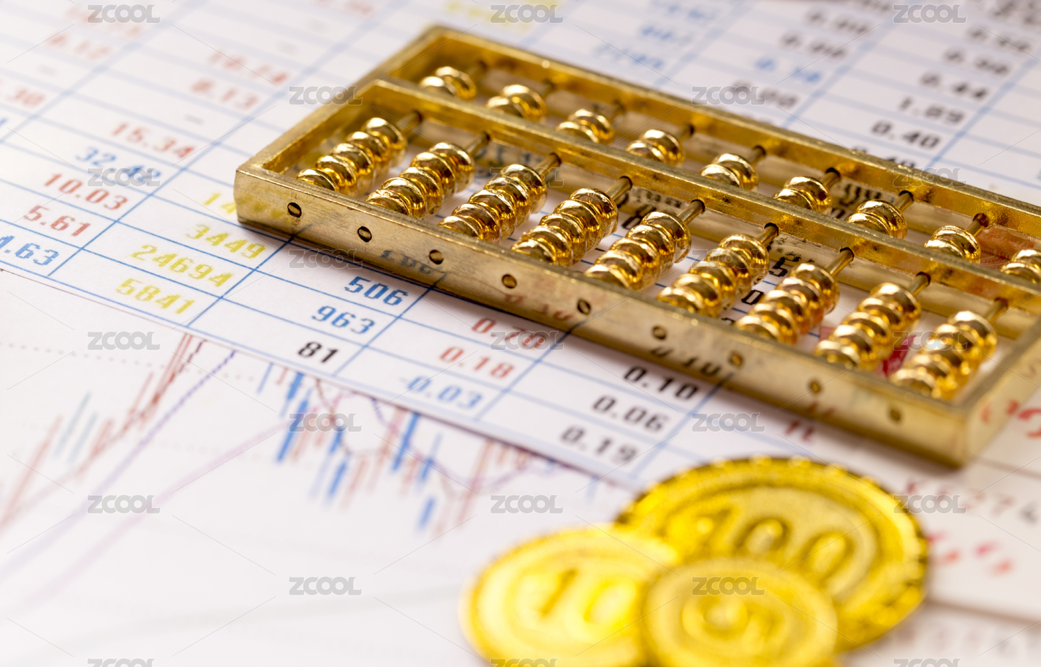 金融经济数据增长概念——放在财务数据报表分析场景上的硬币、算盘和电脑