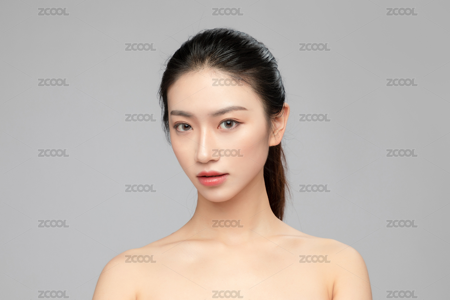 灰色背景里的亚洲美女面部特写,化妆护肤整容