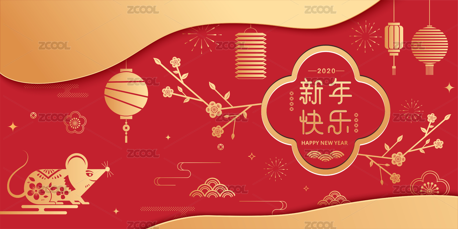 2020鼠年春节新年快乐喜庆红色可爱卡通老鼠新年快乐写春联提灯笼横版