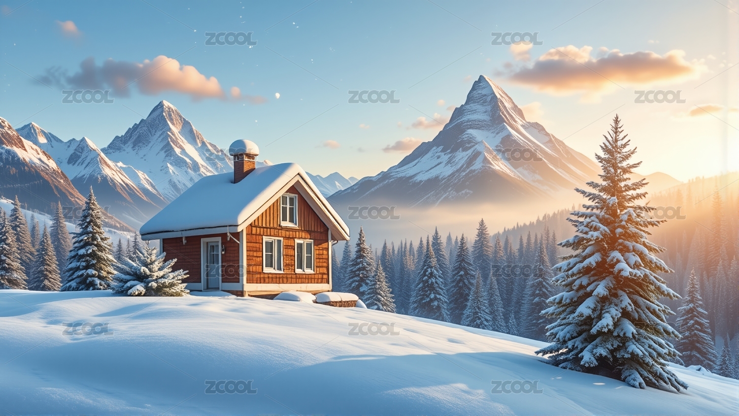雪地,插画,自然背景,房子,大雪,树,乡村,宽阔感,白色