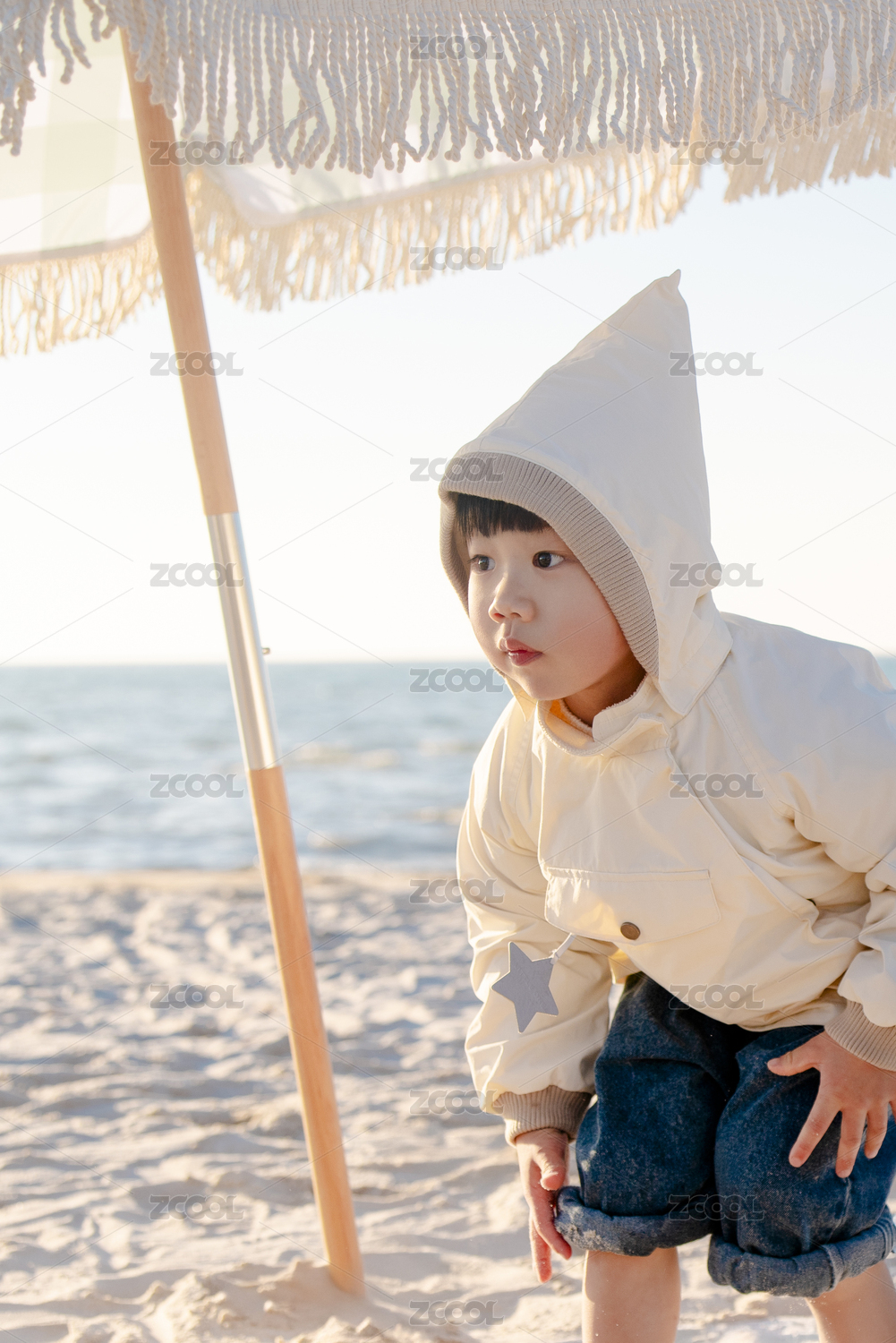 日落余晖时海边遮阳伞下的帅气男孩