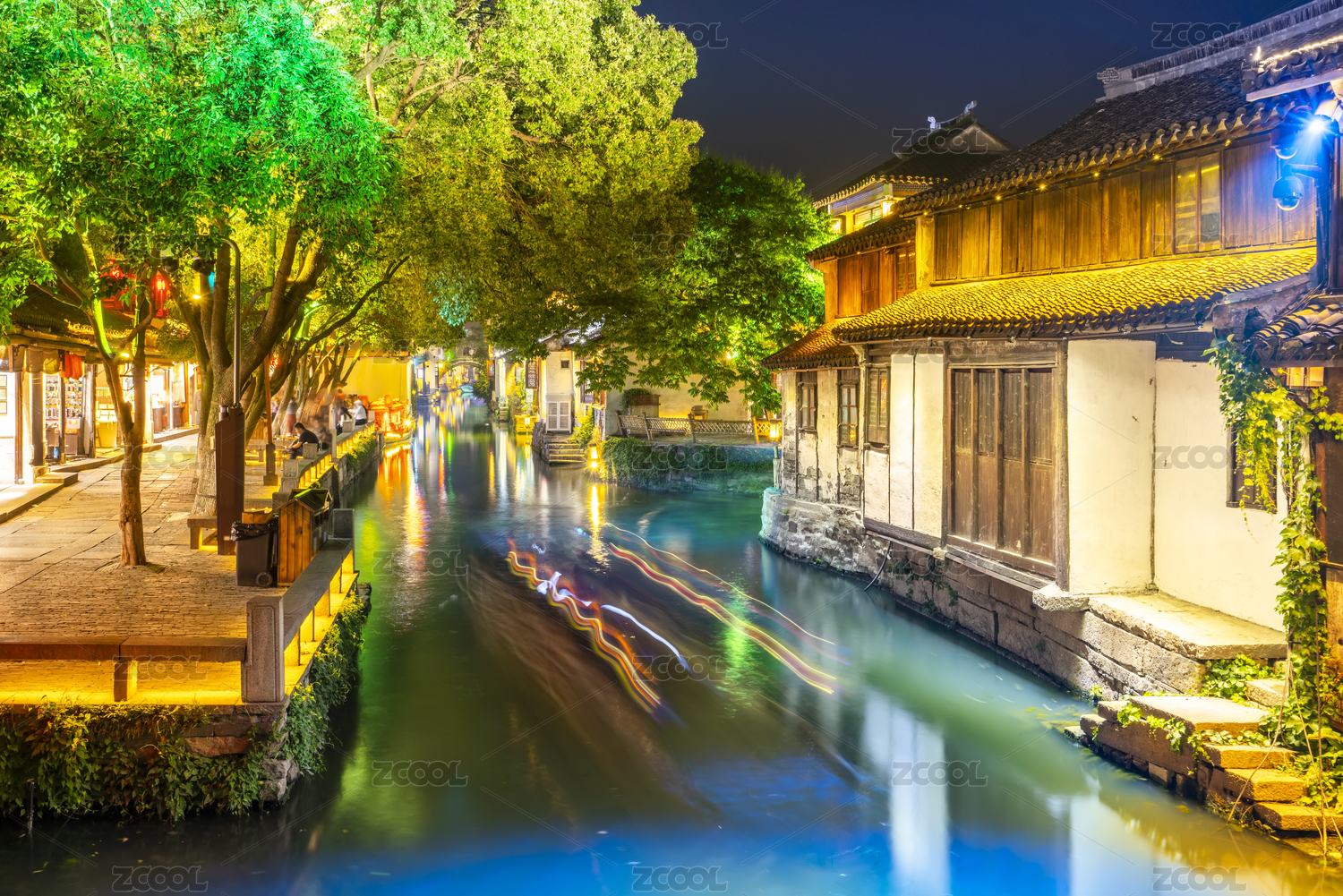 古镇,水乡,夜景,无人,长曝光,夜晚,灯光,步道,河流,老房子