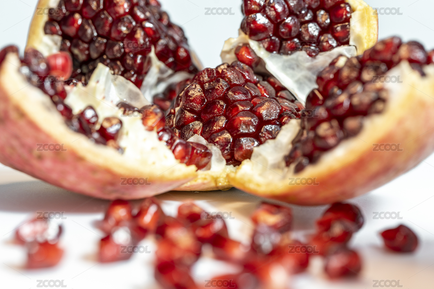 白背景下一堆剥开散落的红色石榴果实