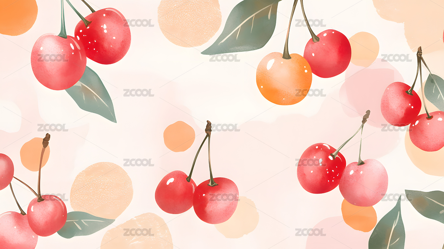 扁平画松弛感白底樱桃蓝色叶子四方连续图