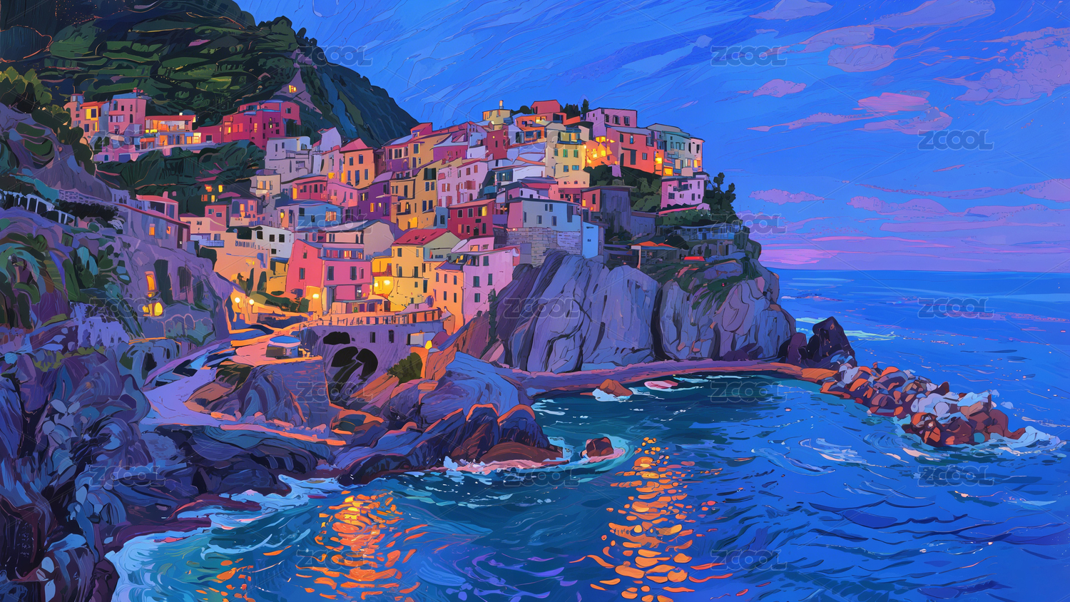 意大利海岸线渔村小镇夜景油画