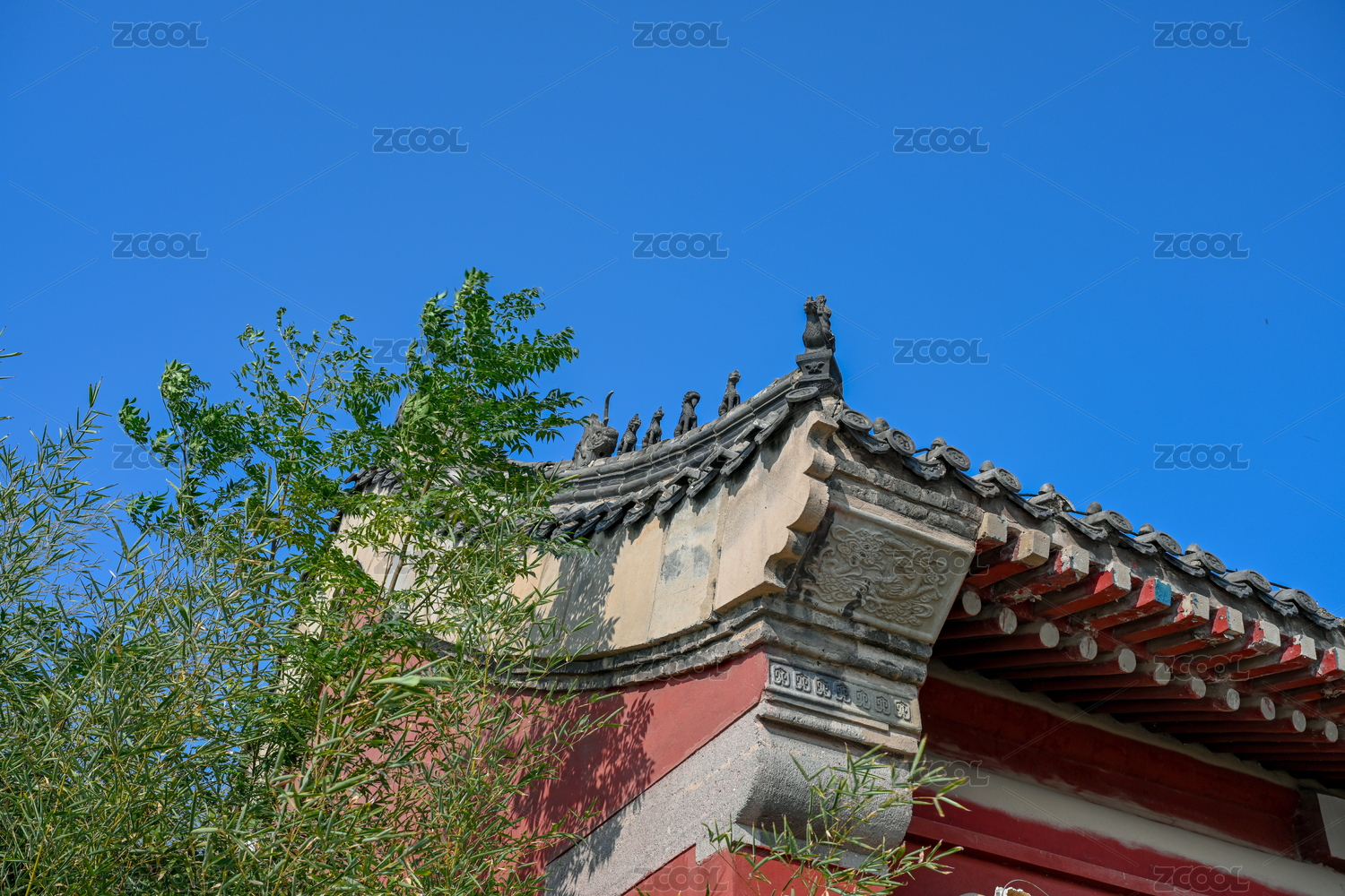 红色,蓝天,绿色,竹子,瓦当,屋檐,屋顶,墙,阳光,砖