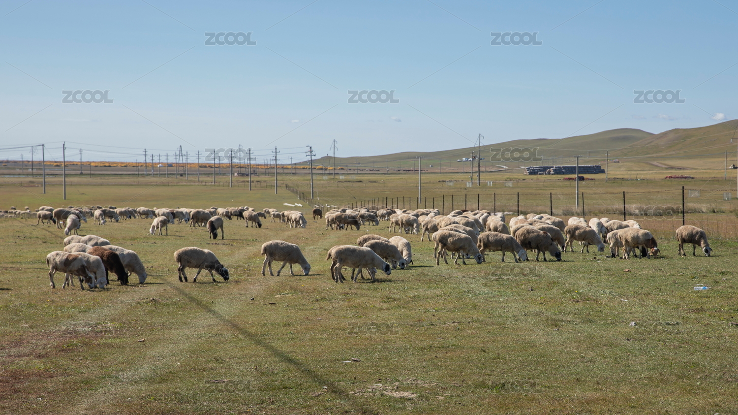 中国内蒙古呼伦贝尔草原上的羊群悠然吃草