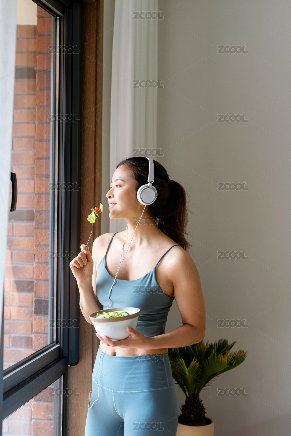 一位年轻的亚洲女性在窗边吃健康的绿色蔬菜