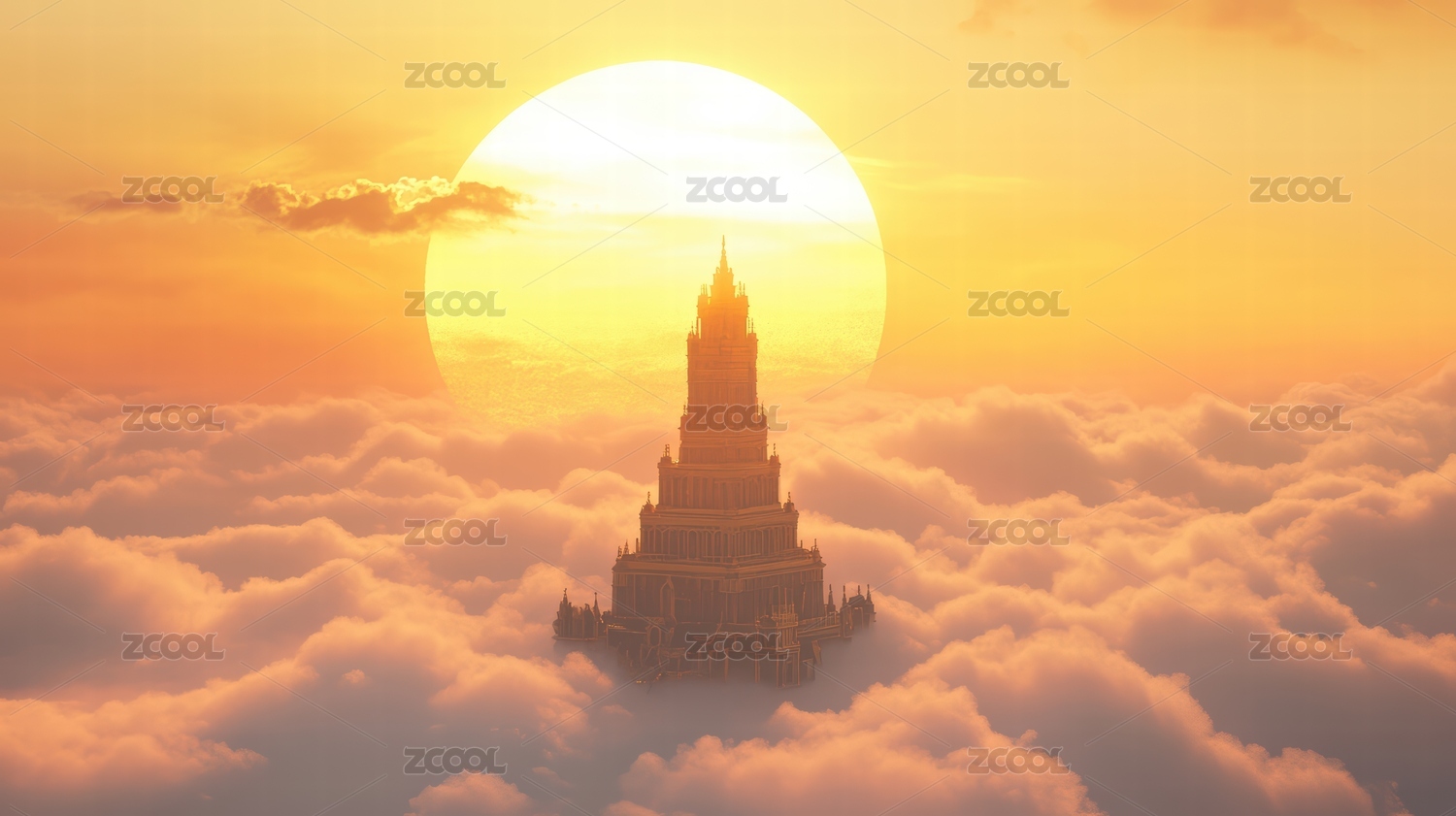 仙境,宫殿,古建筑,云海,天空,天宫,神话,自然,插画,国潮风