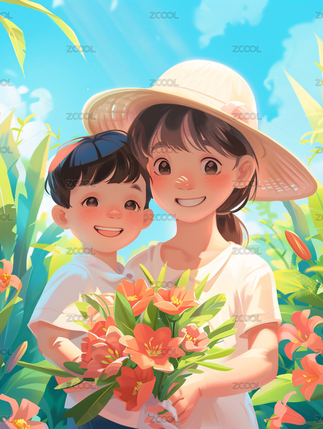母亲节儿子送花给妈妈母子献花场景3D插画