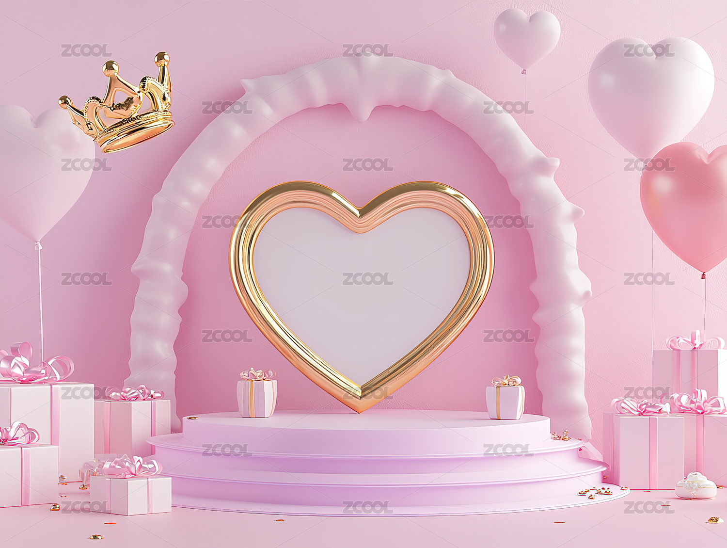 金色,立体,3D,三维,粉色,爱心,礼盒,雅致,立体场景,场景