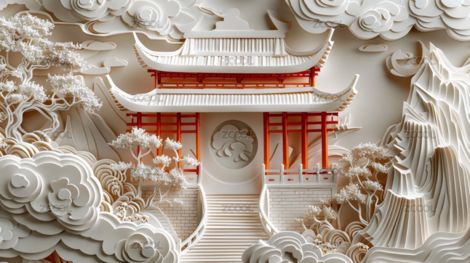 多层剪纸风格中国古代宫殿建筑