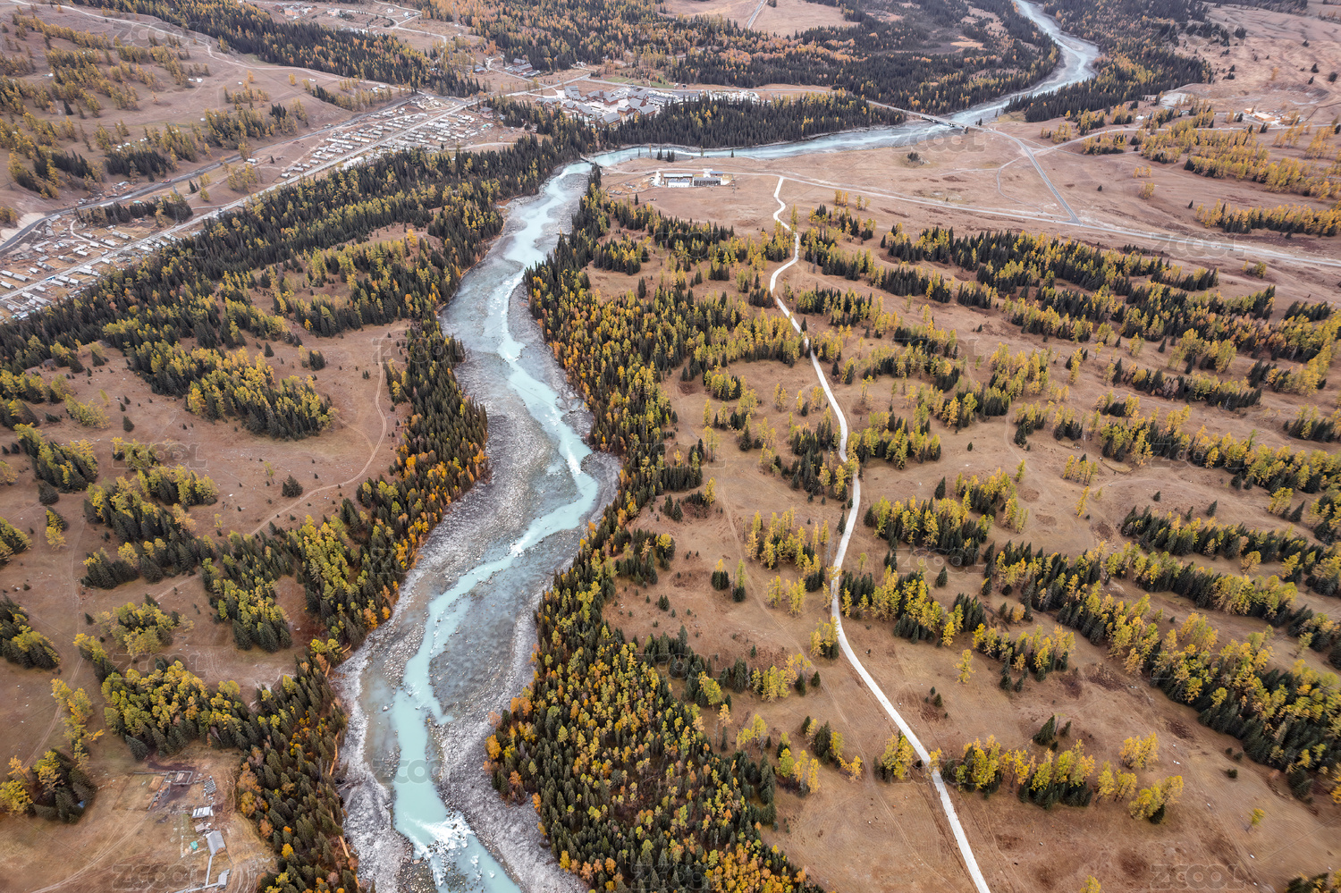 中国新疆阿勒泰喀纳斯禾木秋季航拍风光