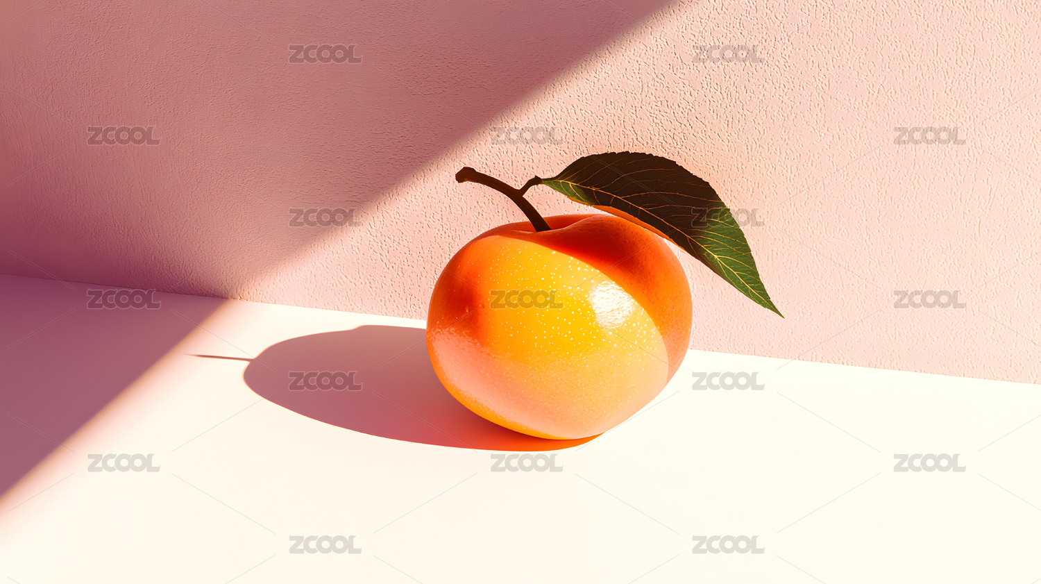 色彩柔和背景上鲜亮橙色水果和绿叶