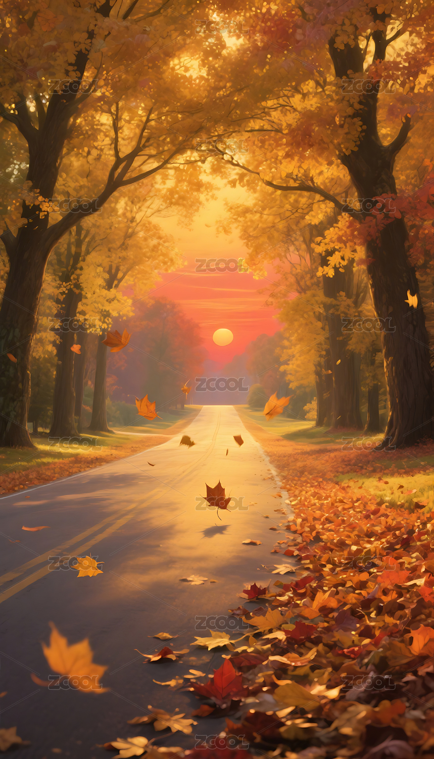 秋天树林下的公路插画背景壁纸