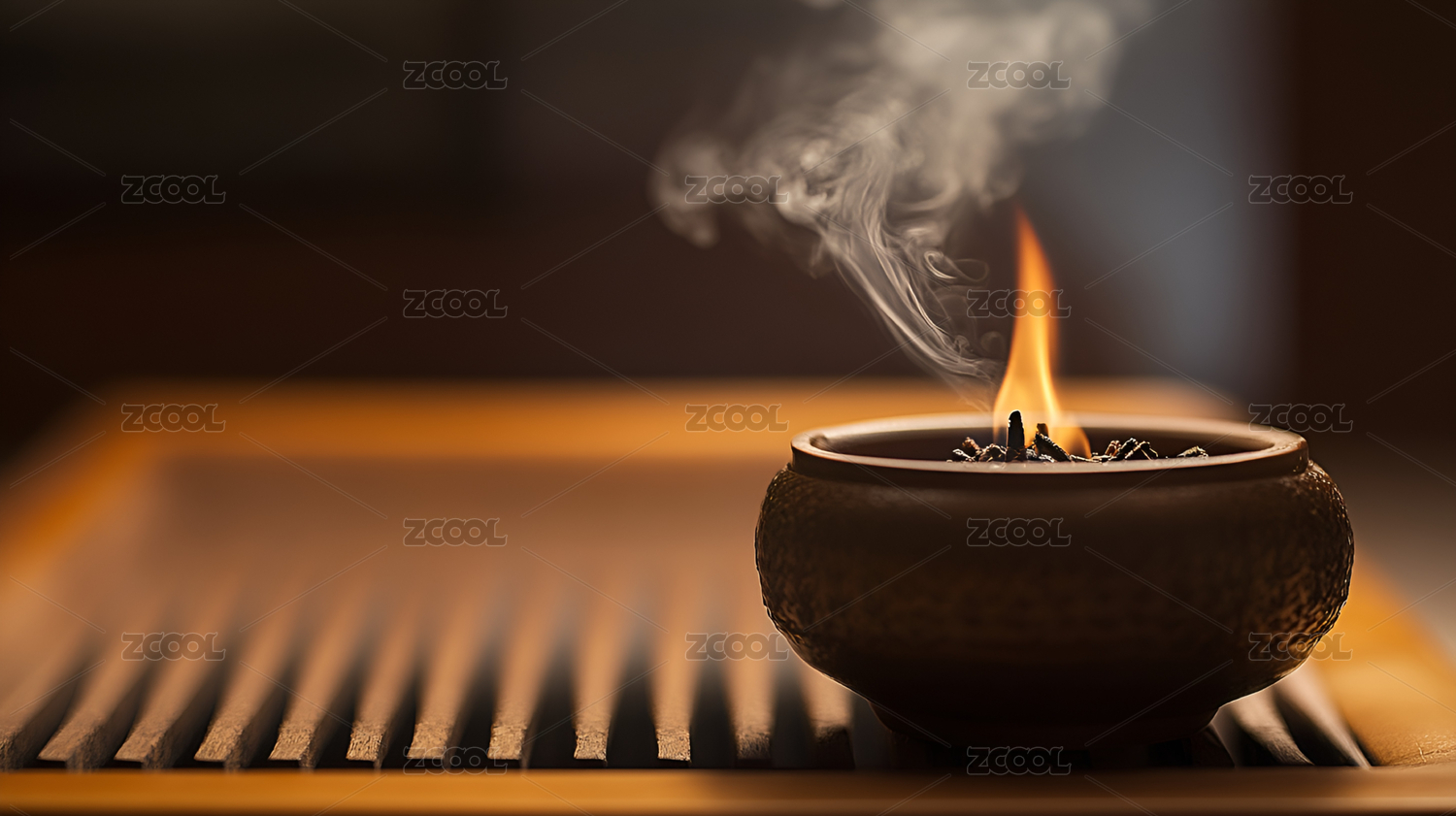 正在香炉中焚烧的沉香线香特写深色调