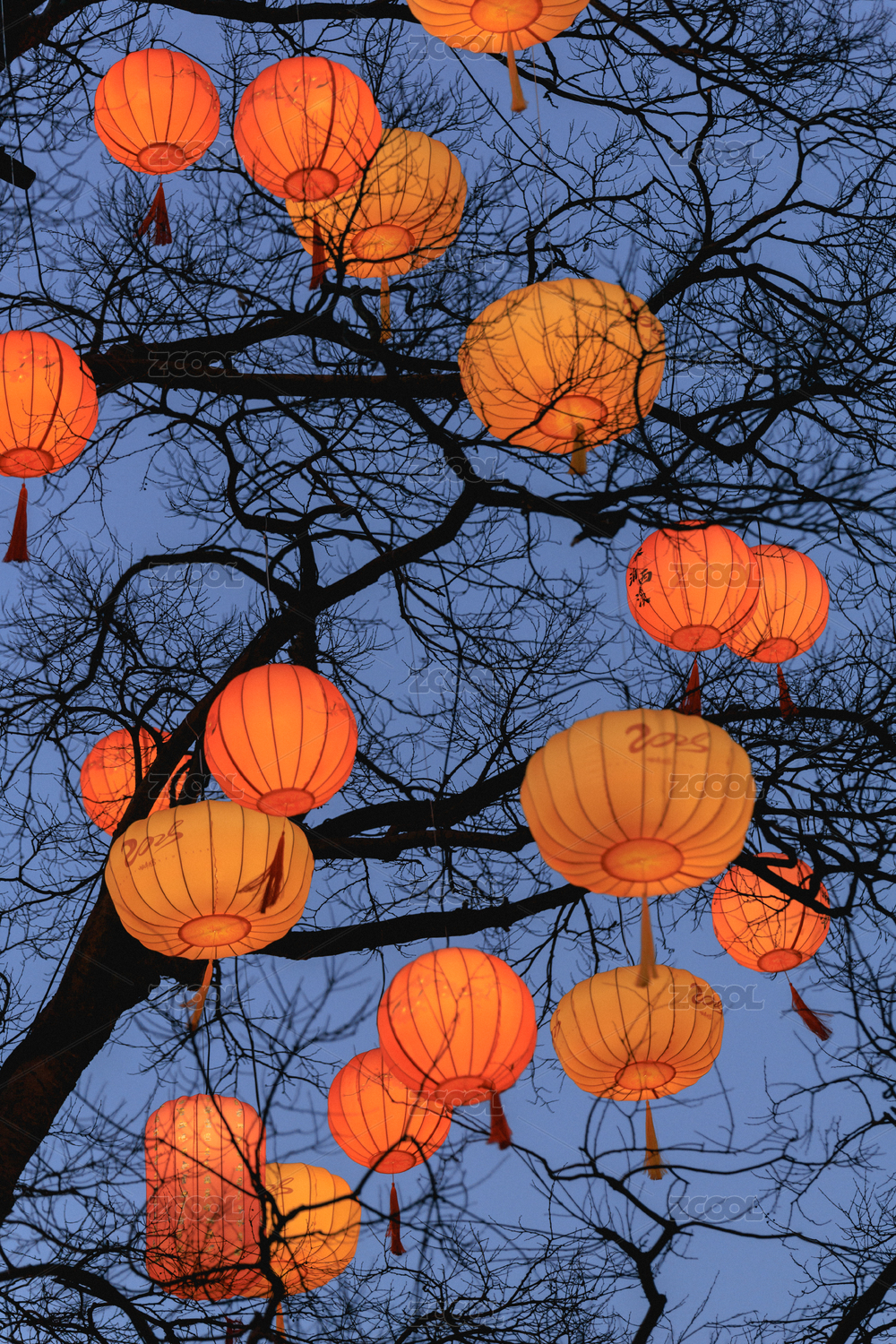 节日庆祝时傍晚树上悬挂的红灯笼