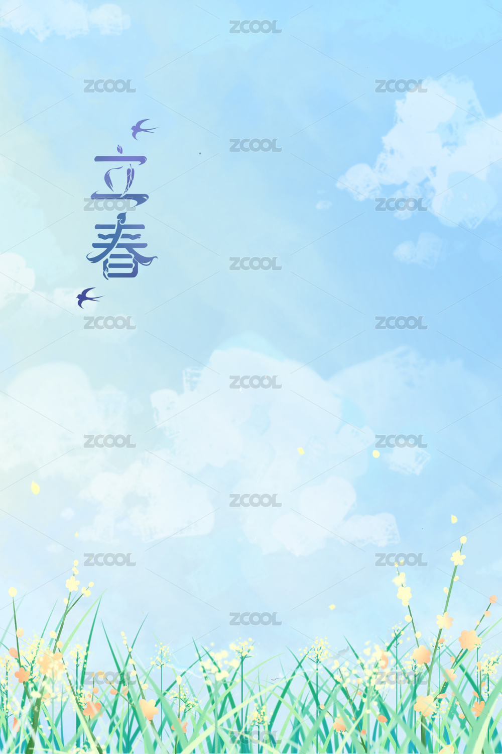 草丛中点缀着小黄花搭配一望无际的天空插画